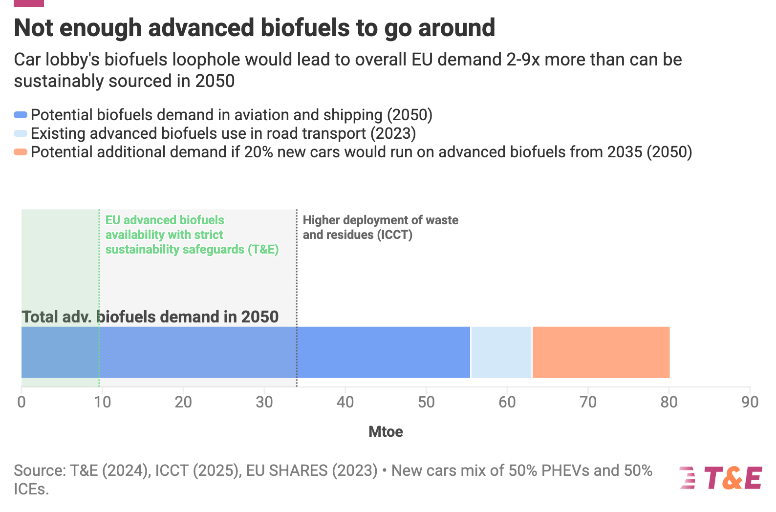 Limited biofuels can’t cover planes and ships, let alone cars: Allowing a biofuels loophole in the EU 2035 cars law would add 30% to aviation and shipping biofuel demand and bring total EU demand to 2-9 times what can be sustainably sourced.