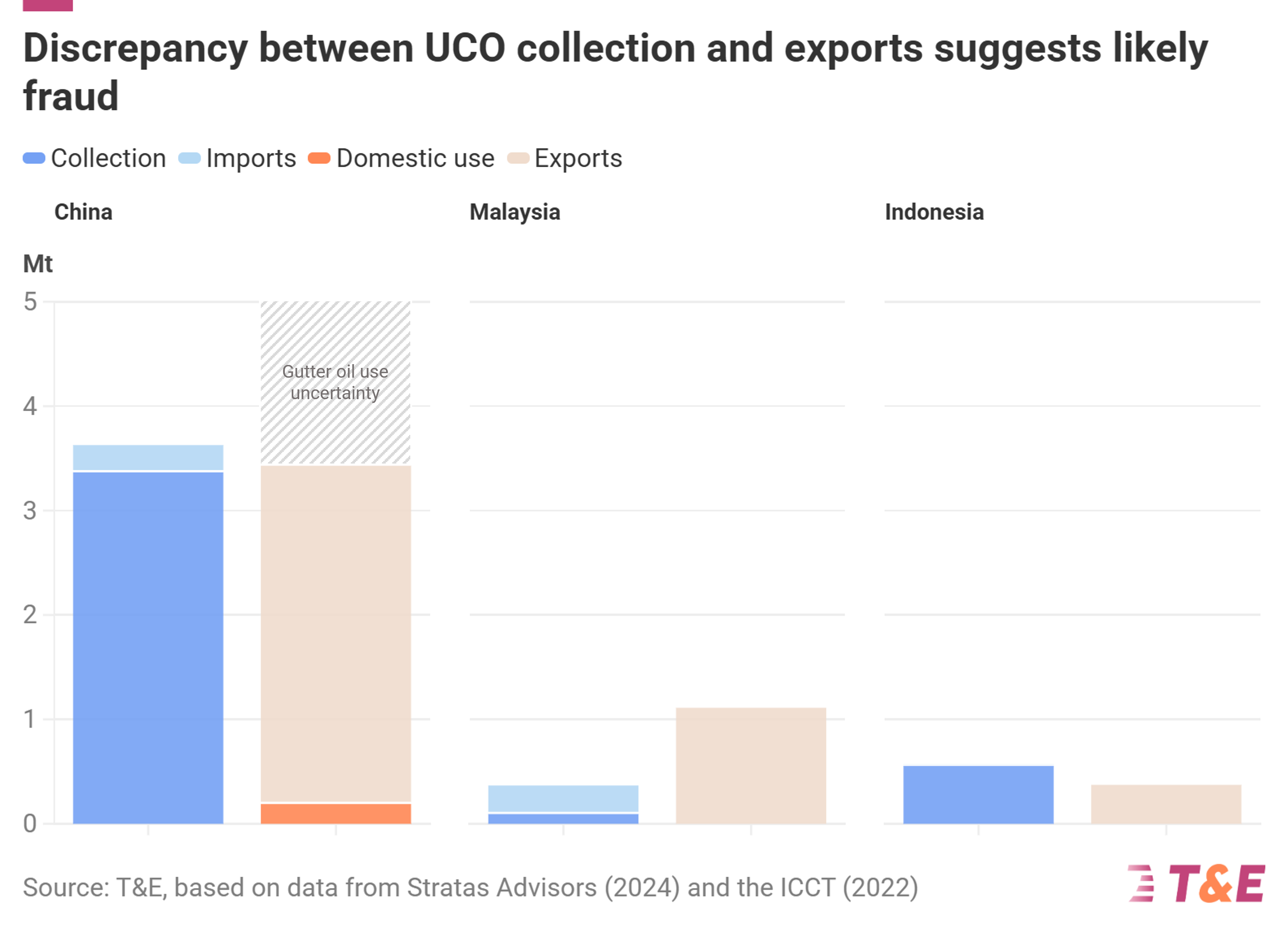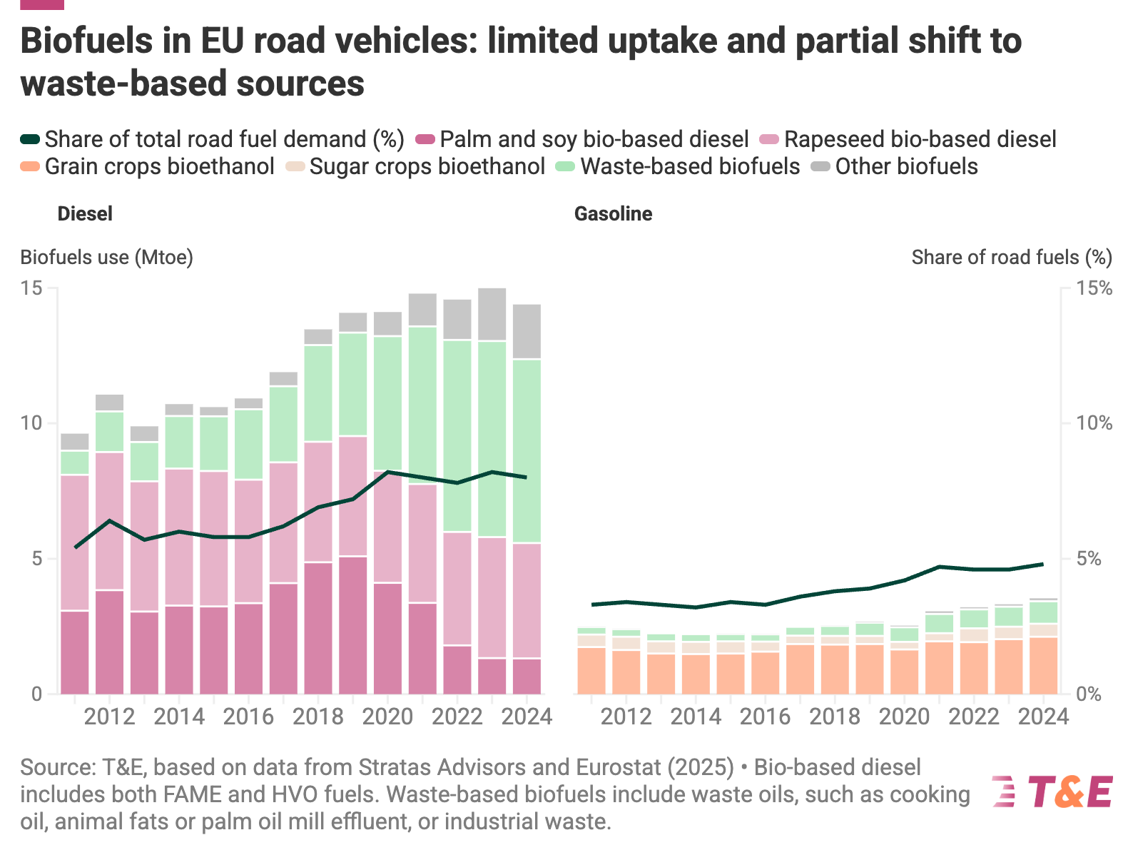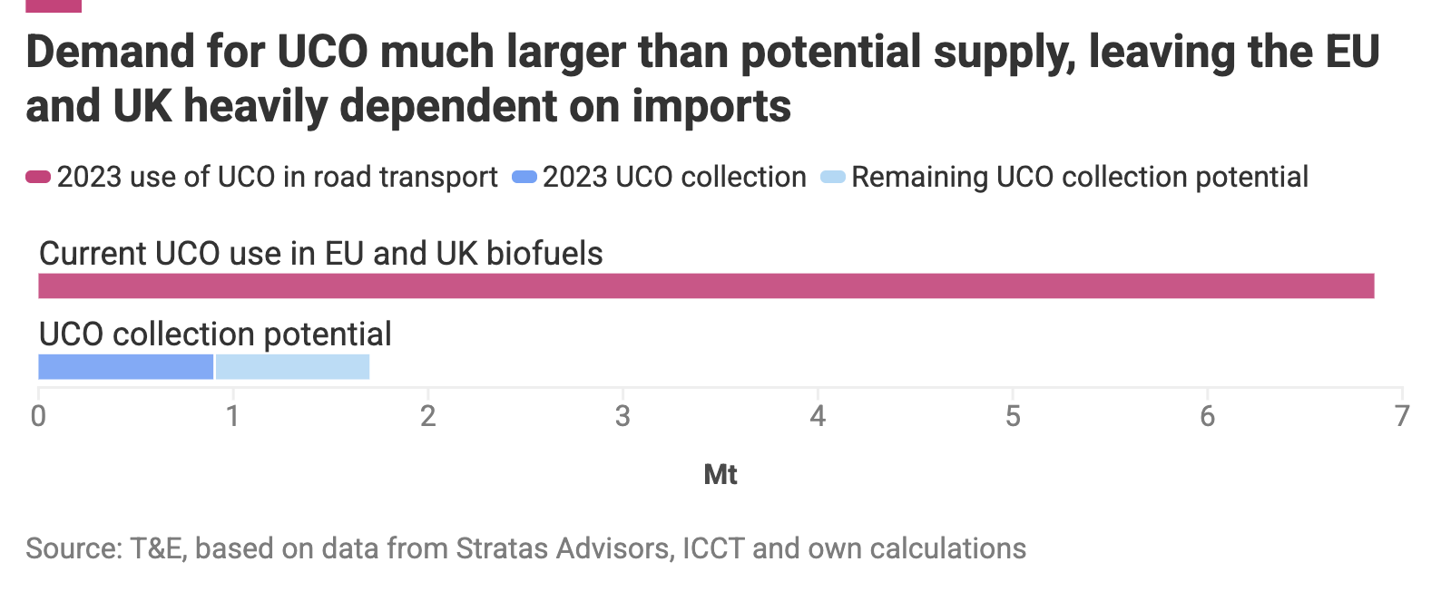 The shift from environmentally damaging crop-based biofuels to waste-based biofuels has maintained a high reliance on imports: Today, 60% of biofuels are imported from non-EU countries. For used cooking oil, >80% is imported.