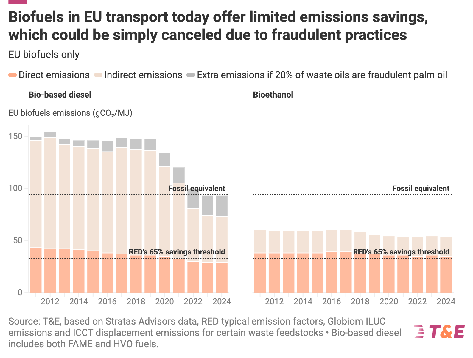 The current EU biofuel mix is delivering limited to non-existent CO2 savings (only 20%-40% CO2e savings vs. fossil fuels on average), and potential waste oil fraud would erase any emissions savings achieved at all.