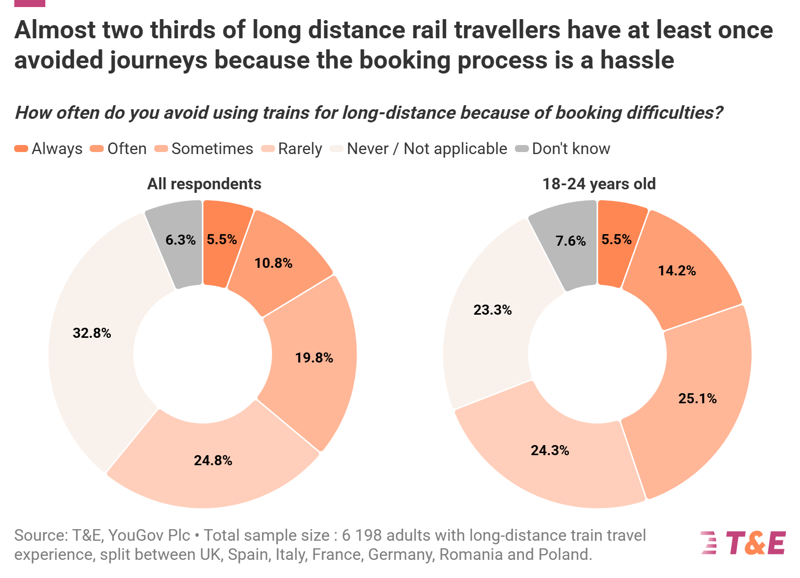 The difficulties of booking train tickets across separate rail operators are turning away many long-distance travellers. Almost two thirds of long-distance rail travellers (61%) have avoided using trains due to booking hassle at least once, a new YouGov poll for T&E in seven European countries finds [1] [2]. 43% of long-distance rail users would use rail more for long distance travel if booking online was easier.