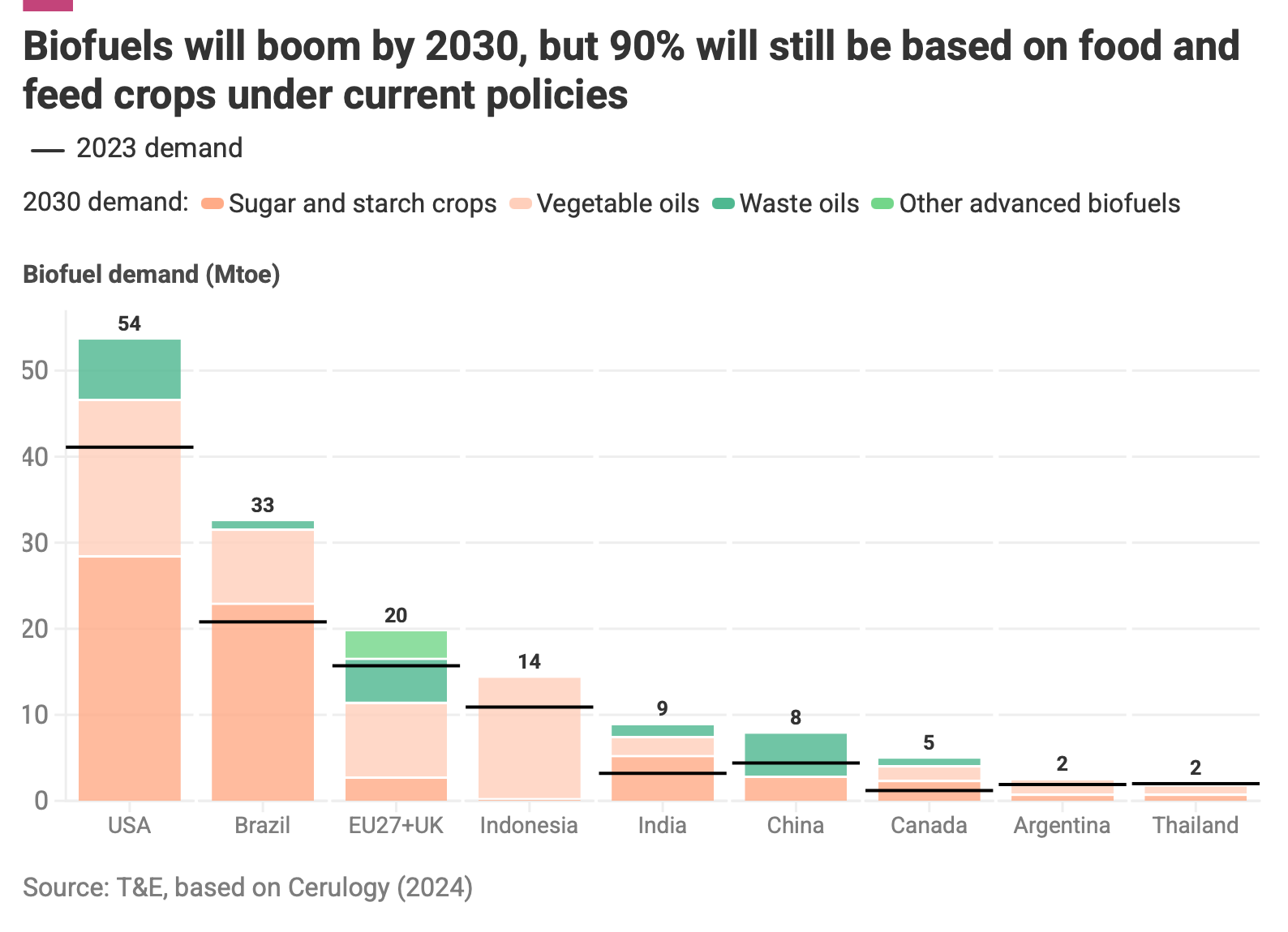 While many claim that the growth in biofuels will come from an expansion in supposedly cleaner waste and advanced feedstocks like used cooking oil and animal fats, the vast majority of biofuels will continue to come from crops in 2030.