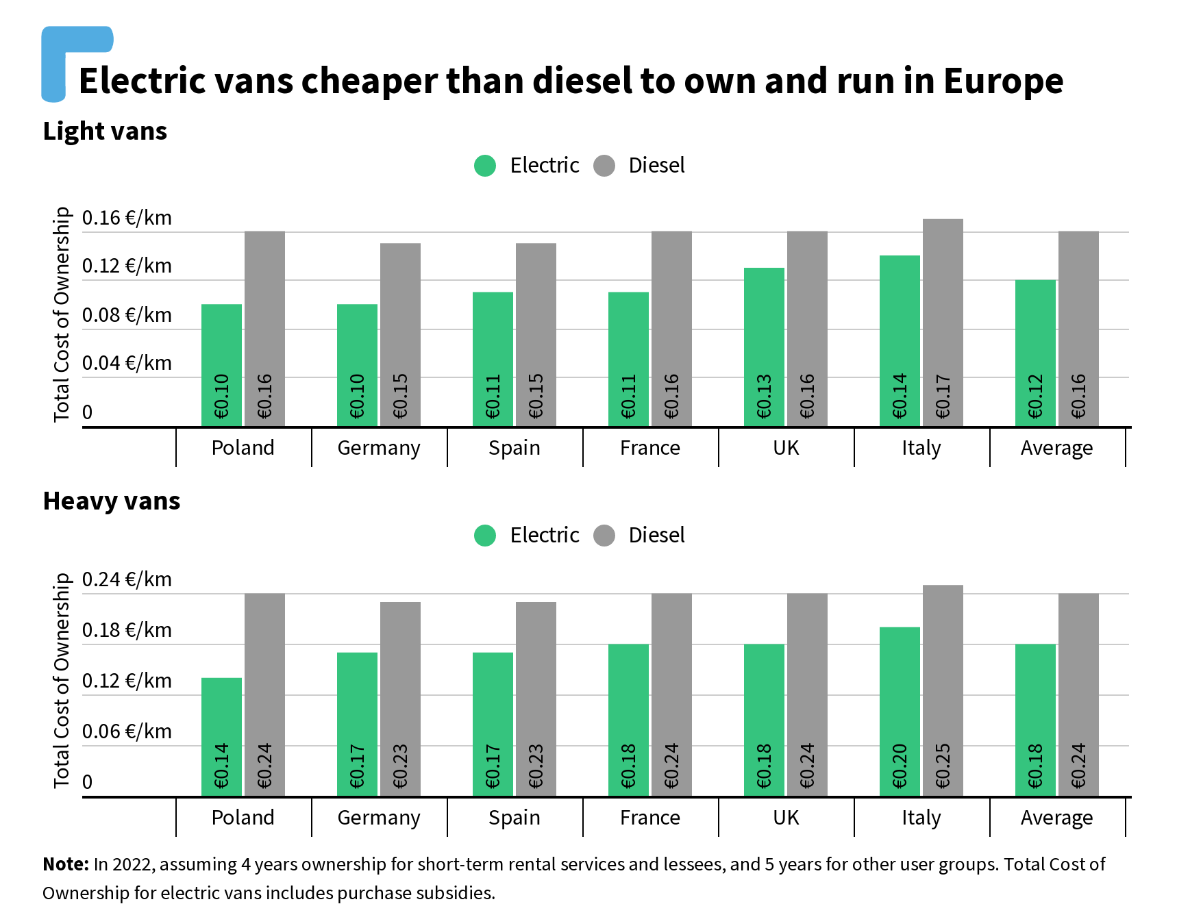 The vast majority of new vans are registered by commercial users, who make vehicle purchase decisions based on total cost of ownership (TCO) including vehicle purchase, running and maintenance costs. It follows that if and when electric vans become cheaper than diesel vans on a TCO basis, van buyers would switch to electric vans instead of diesel vans, provided they do not face major operational constraints.
