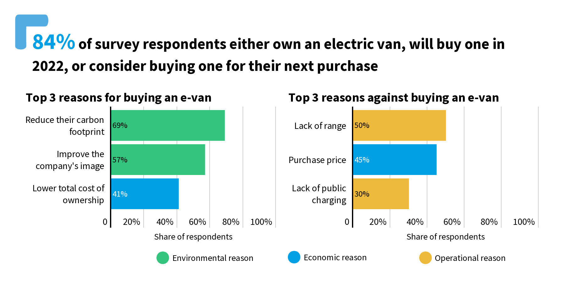 Respondents were also asked about their purchase behaviour in order to identify the main drivers for, and barriers to, e-van adoption. Findings show respondents who buy electric vans primarily do so for environmental and economic reasons, while respondents who have not purchased electric vans justify their decision based on operational constraints, such as range.
