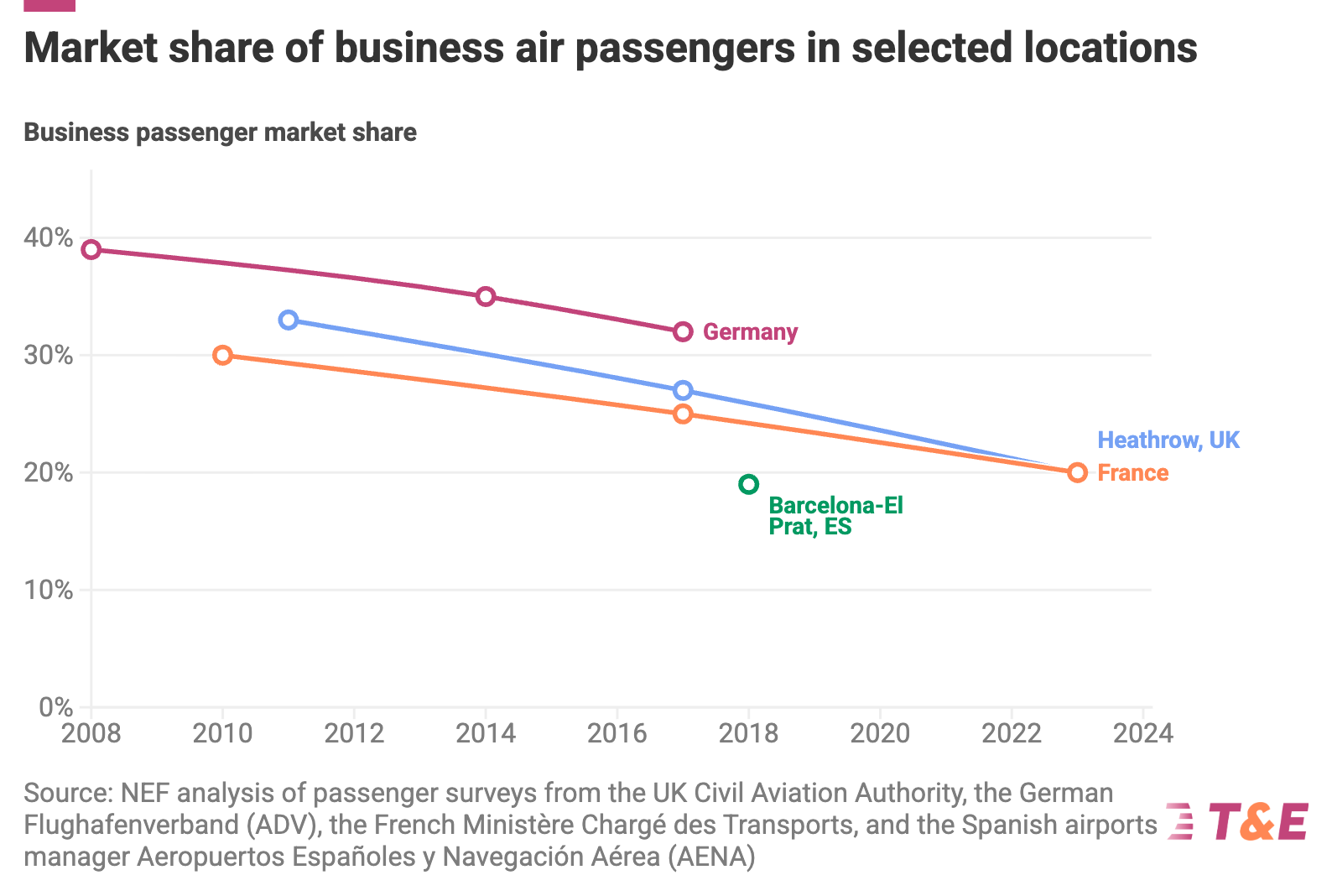 The first factor is changes in the demand for business travel. In Clusters 2, 3 and 4, high levels of air connectivity have saturated this demand. And for a number of business sectors, the marginal benefit of air travel compared with digital alternatives has declined. Data from London Heathrow and Barcelona airports, as well as national data from France and Germany, point to a similar story of declining and/or low business shares of air trips.
