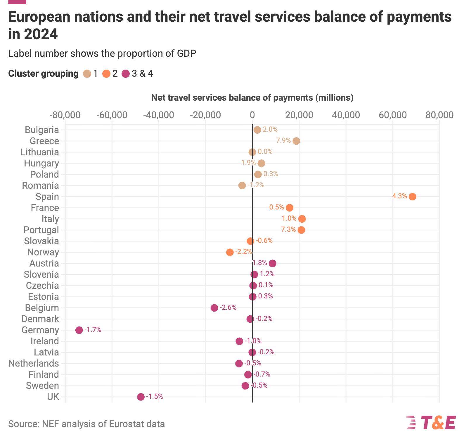 Clusters 1 and 2 see overall average net travel spending surpluses of 1.2% and 1.5% of GDP respectively. However Clusters 3 and 4 show an overall average deficit of 1.2% of GDP - suggesting that air travel is a net drain, rather than a net source of spending flows.