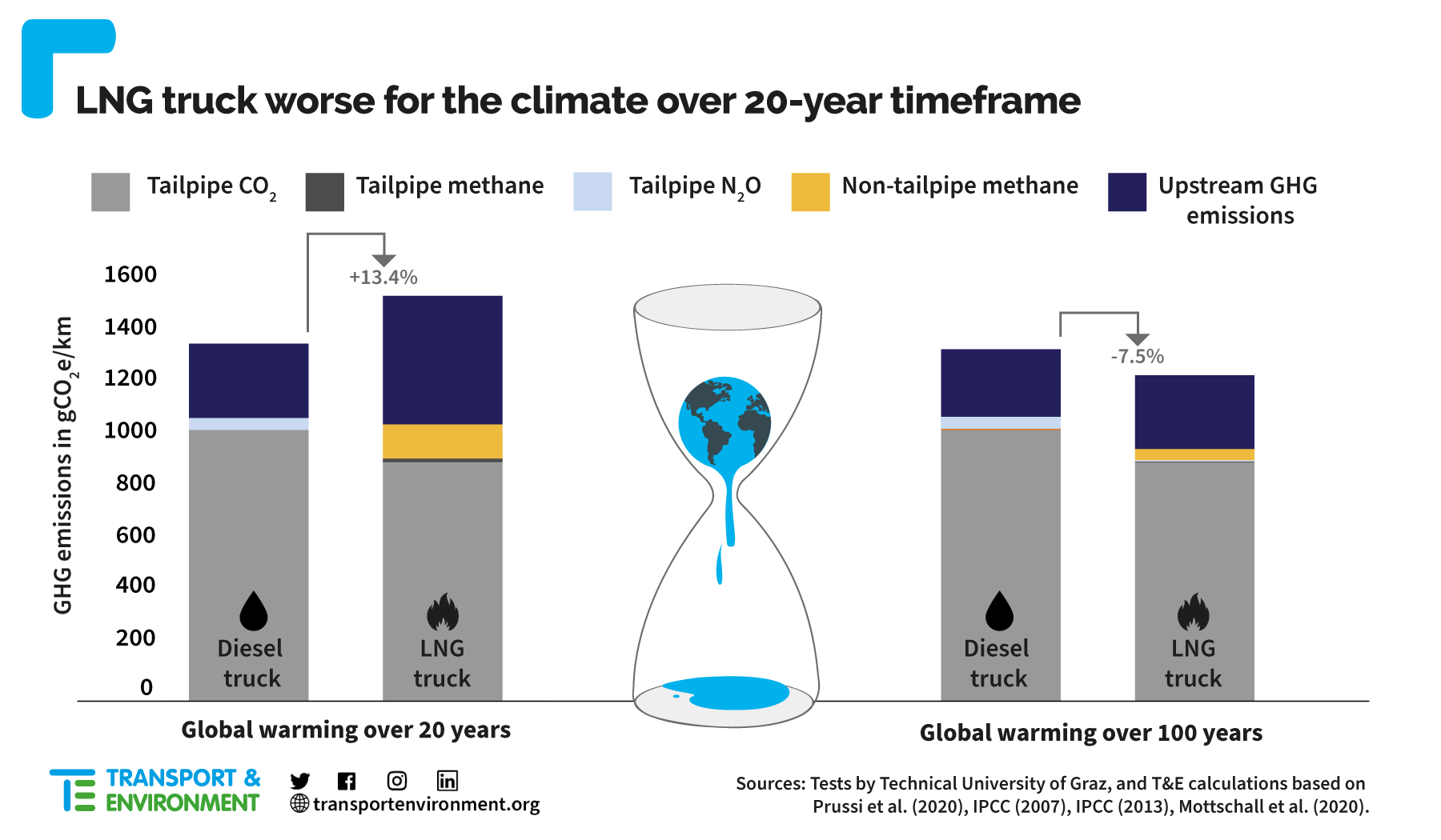 The significantly higher global warming potential of methane over 20 years, compared to a 100-year timeframe, means that increasing the number of LNG trucks on European roads today would actally lead to an increase in global warming over the next few decades compared to the alternatives.