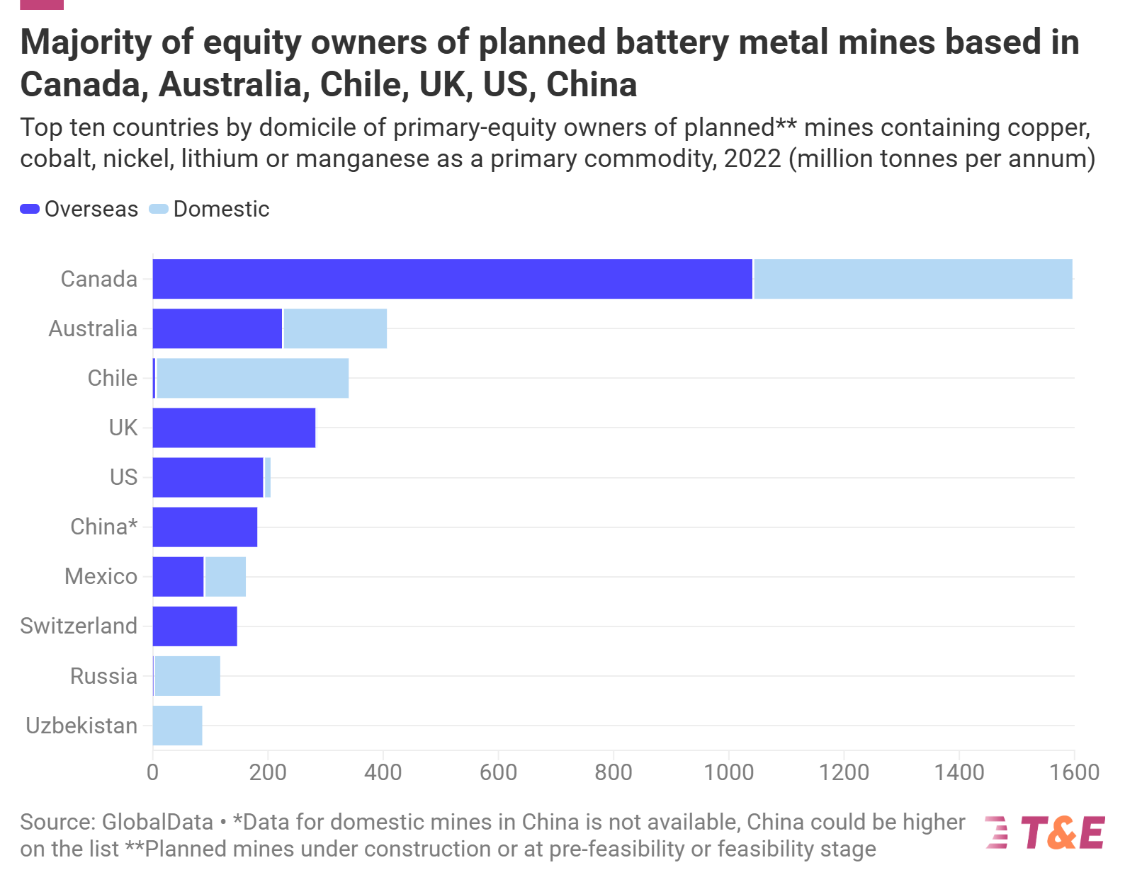 The overall issue is not EU ECA capacity but fragmentation. EU ECAs collectively manage over EUR 100bn in official financing support. Yet there is no EU mechanism to deploy this capital , or from other institutions, strategically. Unlike China, the US or Canada – who have adopted ‘whole-of-government approaches’ – Europe is not mobilising ECAs together with Development Finance Institutions, private investors and industry to form competitive finance packages for domestic or oversea mineral projects. Looking at planned oversea battery metal mines, the majority of equity owners are based in Canada, Australia, the UK and US.