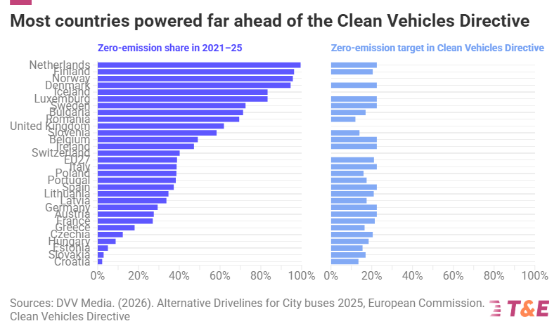 The good news is that the shift is now underway in Czechia, where 26% of new city buses were zero-emission in 2025, and in Estonia, which went from 0% battery-electric in 2023 to 84% in 2024 and 100% in 2025.
