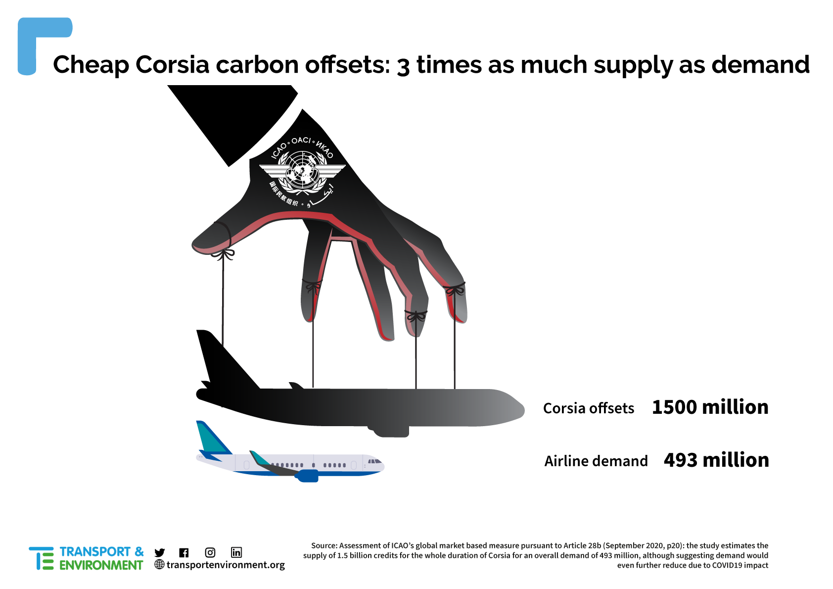 • At less than €1, carbon offsets will be too cheap to deter airlines from growing their emissions.[2] (p20). There is currently an excess supply of carbon offsets due to a weakening of the Corsia rules following industry lobbying last year, with three times as much supply than demand.