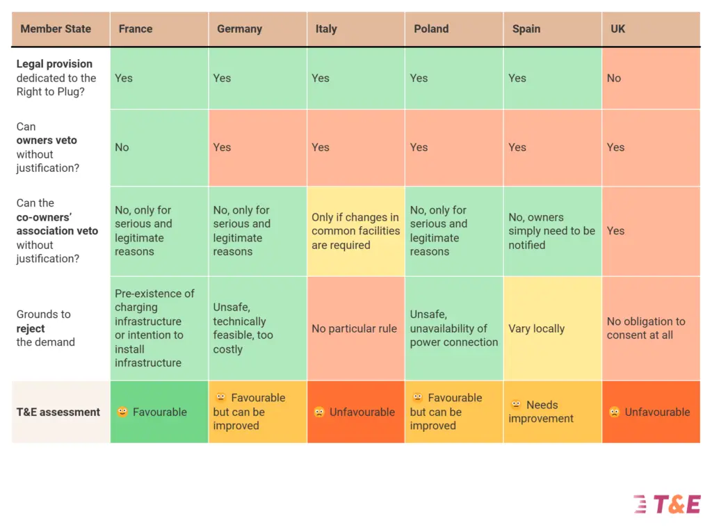 T&E analysed the regulatory framework in 6 countries (France, Germany, Italy, Poland, Spain and the UK), and compiled best to ensure that EV drivers can have seamless access to home charging, whether they live in a house or in an apartment.