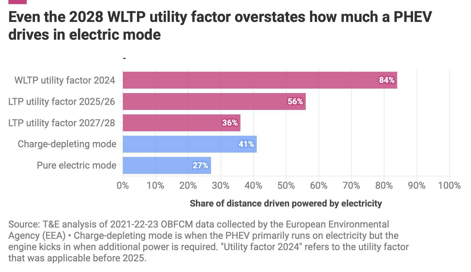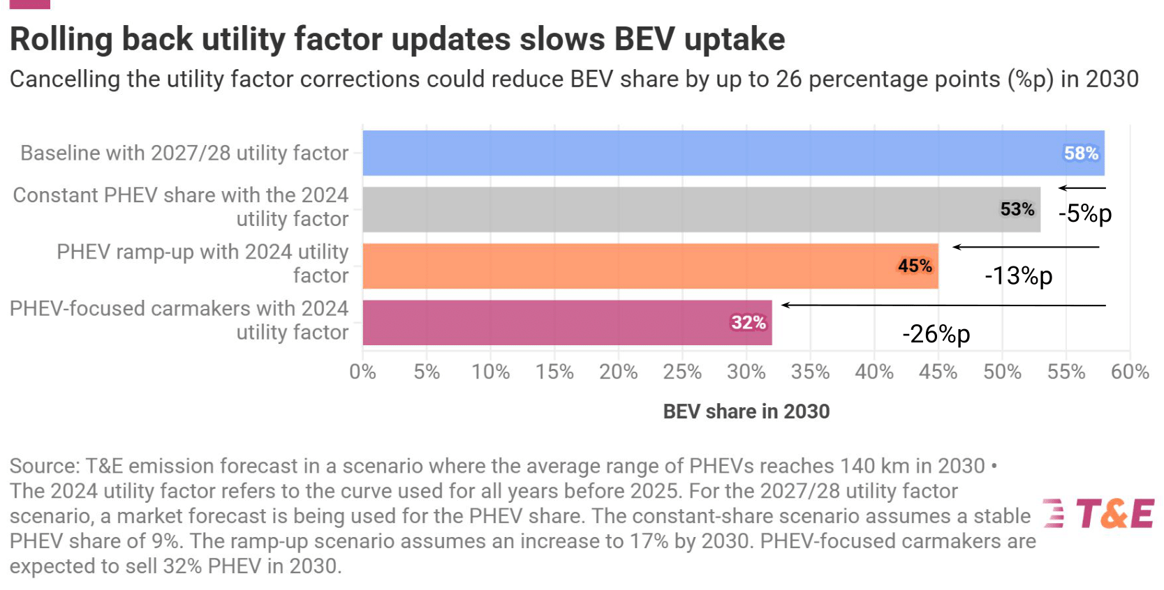 Cancelling the utility factor correction would slow the transition to zero-emission mobility as carmakers would need to sell 45% BEV, rather than 58% under current regulations. PHEV-focused carmakers could limit BEV sales to just 32%.