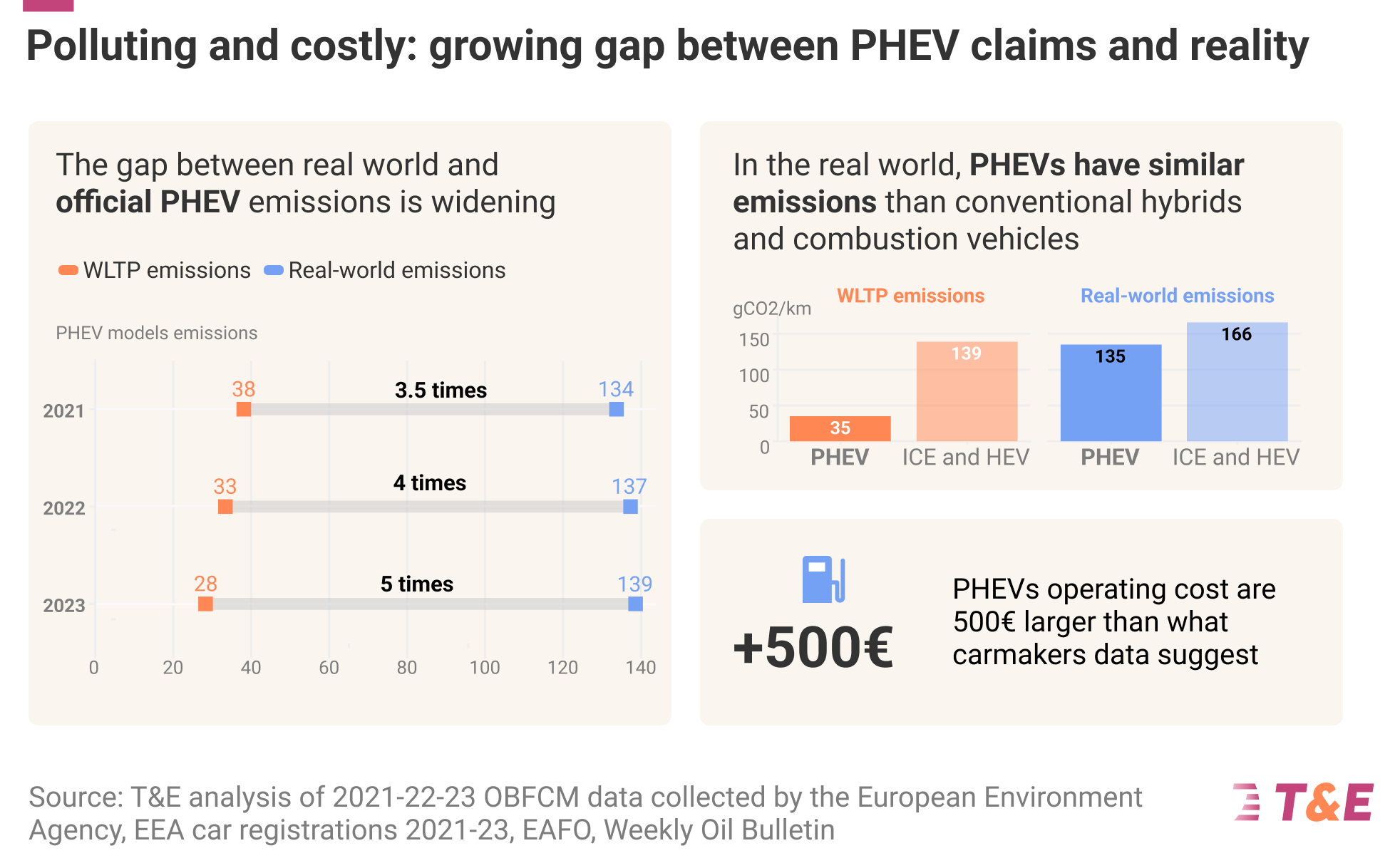 Even in electric mode, PHEVs still burn fuel and emit 68g of CO2/km, on average. Their hidden fuel consumption costs the average PHEV driver €500 extr...