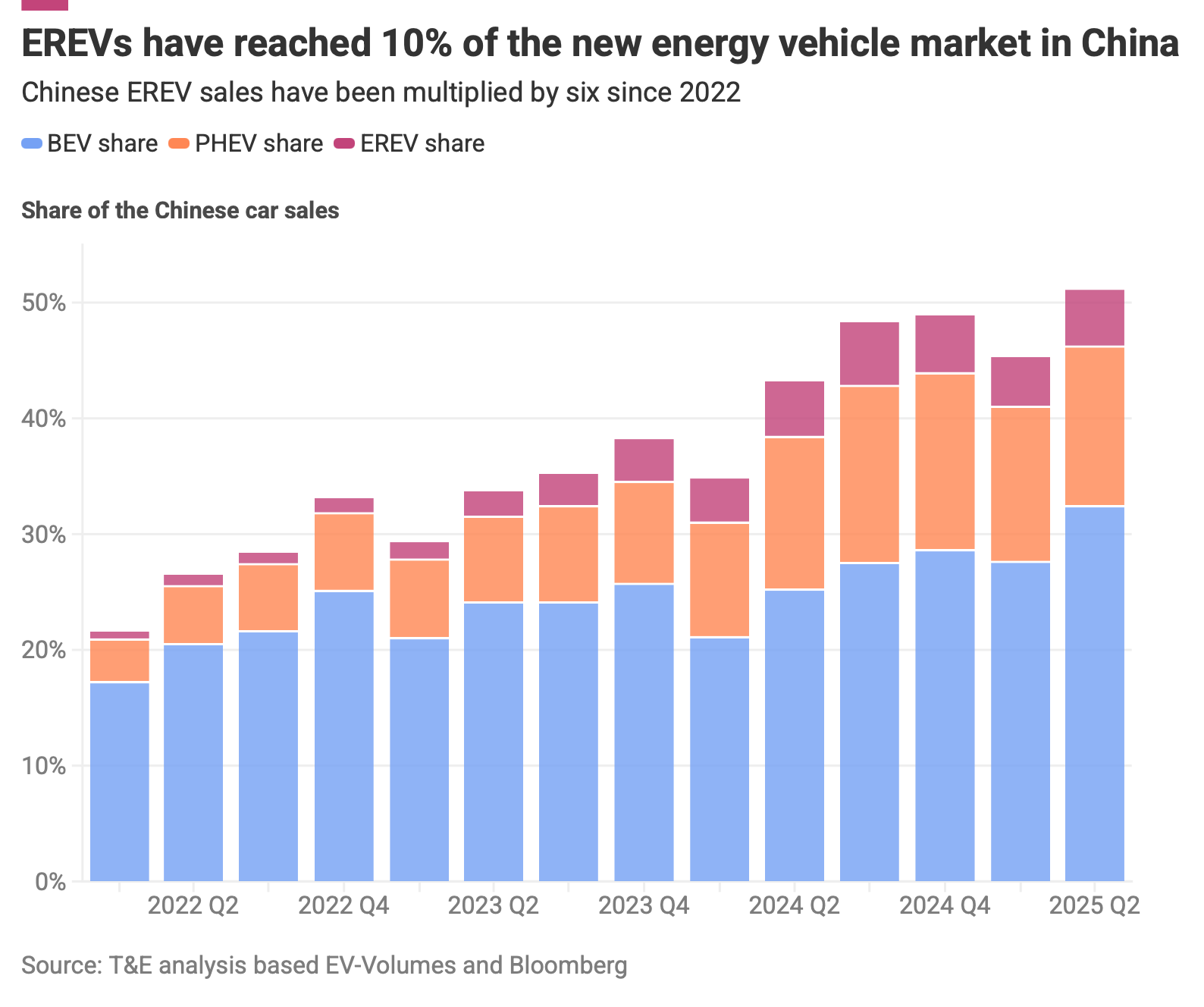As the Chinese new energy vehicle (NEV) market exceeded 50% of the total car sales in Q2 2025, EREVs have reached 10% of the NEV market. In terms of sales units, EREV sales have increased sixfold since 2022, accounting for 5% of the total car market in China.