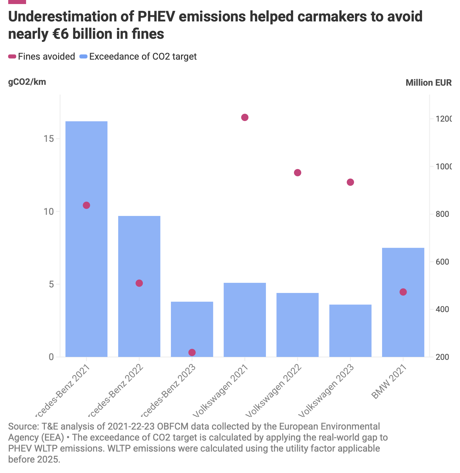 WLTP flaws have allowed four major carmaker groups to avoid more than €5 billion in fines between 2021 and 2023. The underestimation of emissions by the WLTP directly benefitted OEMs by making it easier to comply with fleet-average CO₂ targets. Between 2021 and 2023, real-world data shows that carmakers emitted nearly 52 million tonnes more CO₂ than official figures suggest. If PHEV sales shares had remained the same but compliance had been based on real-world emissions rather than WLTP values, OEM pools would have needed to compensate for this excess by increasing BEV sales to avoid penalties. The shortfall in necessary BEV sales over this period equates to 1.1 million vehicles.