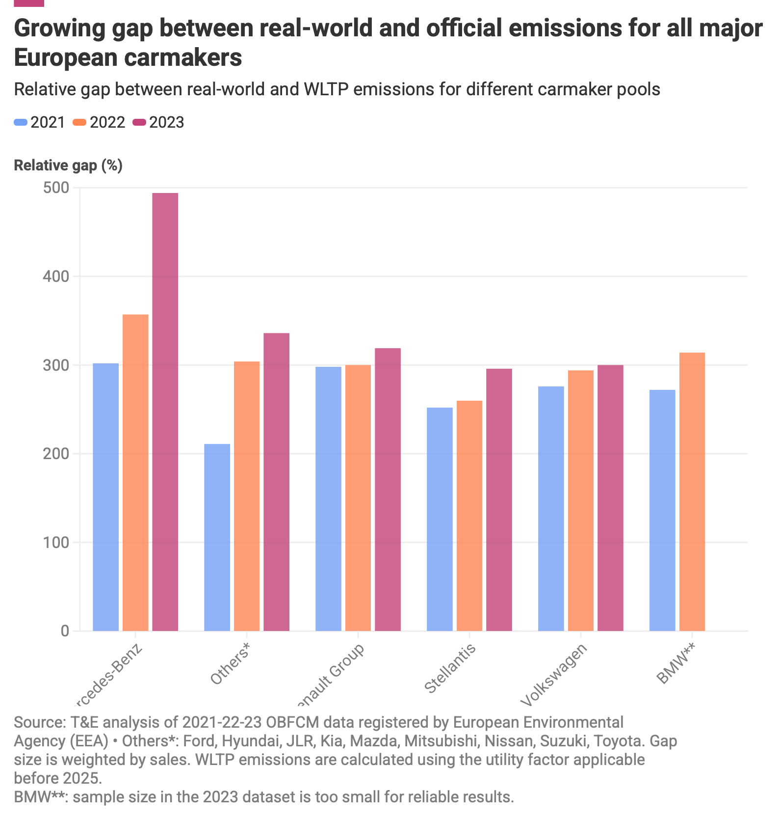 The gap between WLTP figures and real-world emissions for PHEVs is widening year by year across OEM pools. For vehicles registered in 2021, 2022 and 2023 the divergence has grown steadily for all major European carmakers, with Mercedes-Benz group showing the most pronounced increase: its 2023 PHEVs exhibit a gap of 494%, significantly more than from other carmakers, underlining again how some manufacturers benefit increasingly from WLTP’s shortcomings.