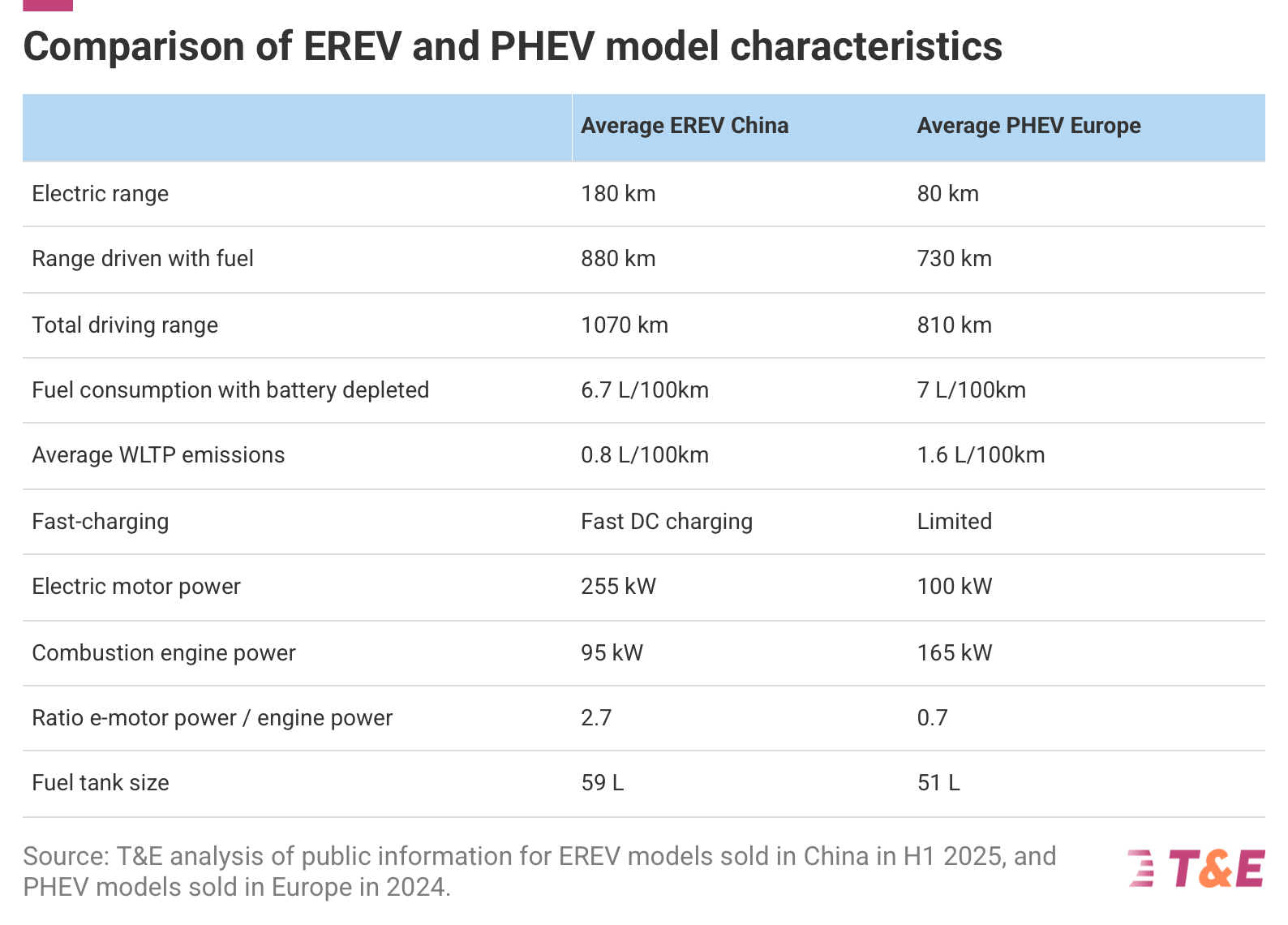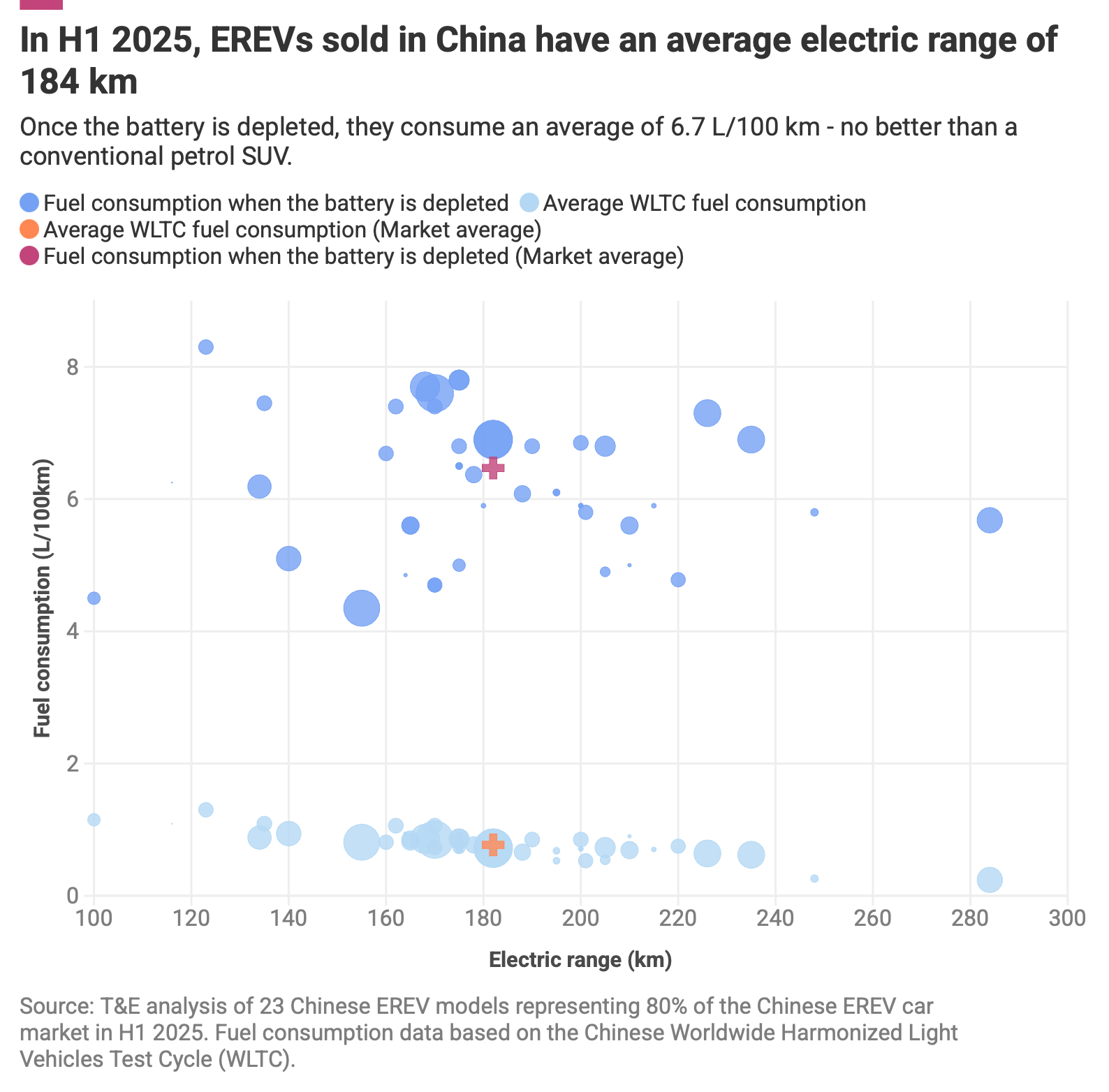 EREVs, like PHEVs, rely on their combustion engine for extended range. With large fuel tanks, Chinese EREVs can drive 900 km in combustion mode, consuming 6.7 L/100 km — similar to some European petrol SUVs.