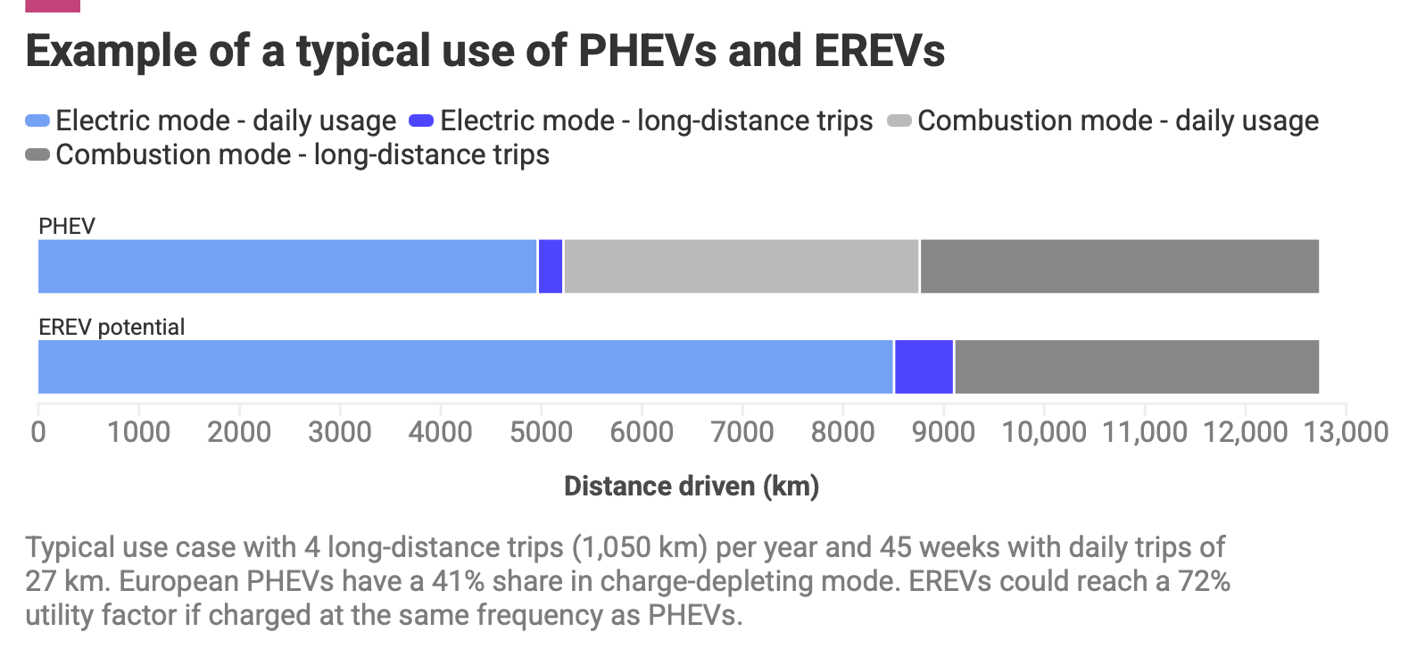 With four long-distance trips over 1,000 km per year and daily use in electric mode, EREV could potentially reach a 72% utility factor