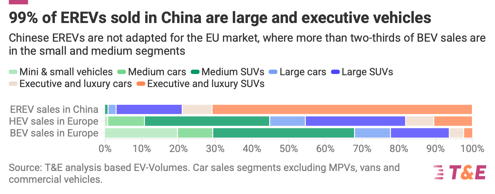 In China, 99% of EREVs are sold in the larger segments (segment D and above), predominantly in the executive and luxury SUV segments. However, these large SUV models would not meet the needs of the European market, where executive and luxury vehicles represent only 6% of BEV sales and 18% of PHEV sales. Furthermore, these vehicles would compete with similar-sized European PHEVs which have stronger brand recognition. From a technical perspective, SUVs and larger vehicles provide more space for a dual powertrain. Furthermore, buyers of larger vehicles can absorb the additional costs of an EREV drivetrain. Some medium-sized C-segment EREVs such as the Deepal SL03 (electric range of up to 165 km) are sold in China.