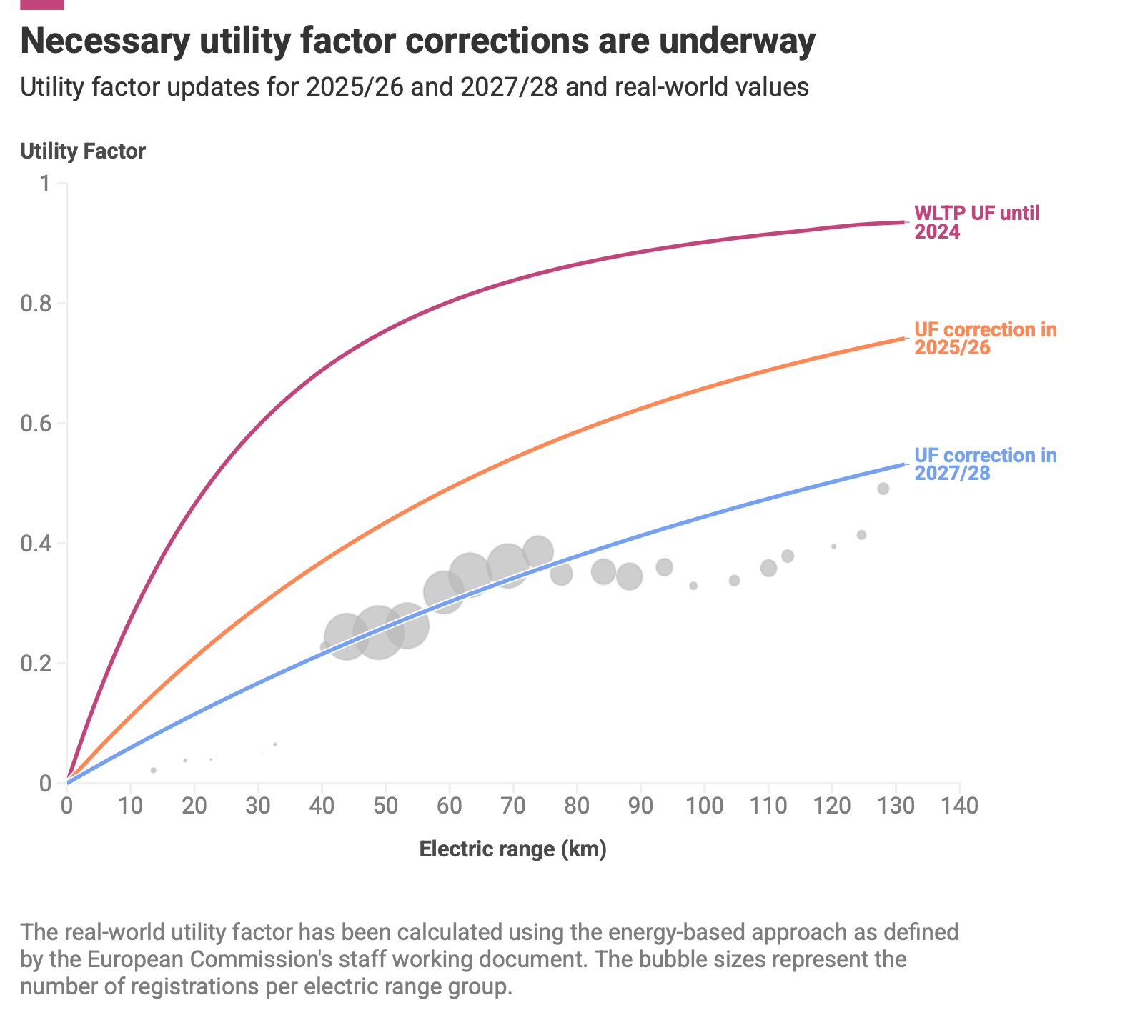Utility factor overestimation: For long-range PHEVs, the share of driving assumed to be electric is overstated roughly twice as much as in the other range groups (see first chart in Section 1.1)