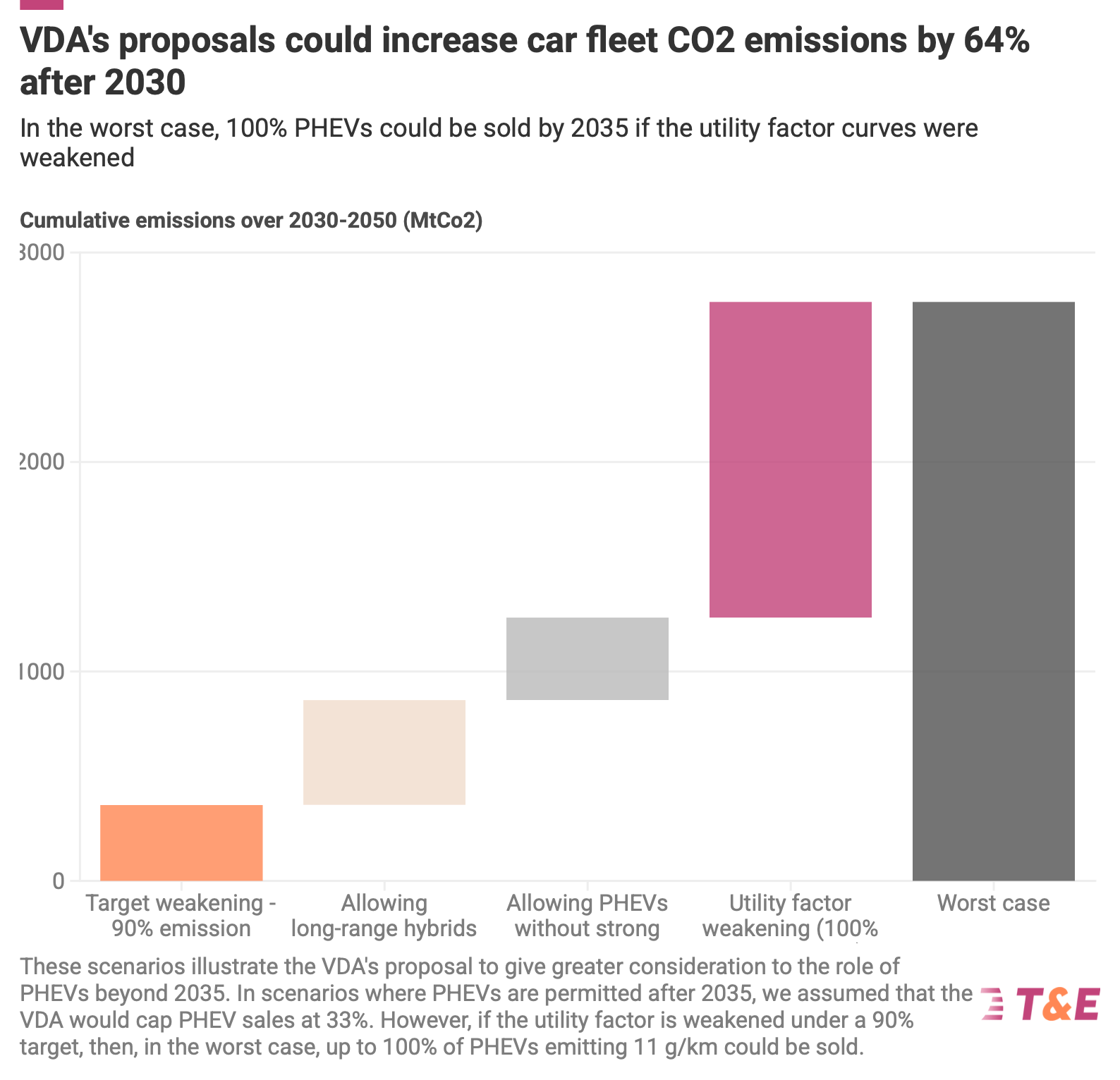In June 2025, the German Association of the Automotive Industry (VDA) presented a comprehensive 10-point proposal to weaken the car CO₂ regulation. We have selected three measures related to hybrid models from their proposal and assess them. Combining these three measures could lead to an additional 2.8 GtCO₂e being emitted by European cars between 2030 and 2050, posing a major threat to the EU's climate targets. This represents a 64% increase compared to emissions from a baseline scenario based on current car CO₂ regulations. For reference, the European Scientific Advisory Board on Climate recommends that the EU's greenhouse gas emissions budget for the period 2030–2050 should be kept within a limit of 11–14 GtCO₂e, in order to limit global warming to 1.5 °C. Therefore, if the VDA's proposal on hybrids is adopted, additional European cars sold after 2030 would consume a fifth of the total EU remaining carbon budget while the whole car fleet would consume half of the carbon budget. The VDA proposal would therefore derail the EU's path to carbon neutrality. Further information on this section can be found in Annex A.11.