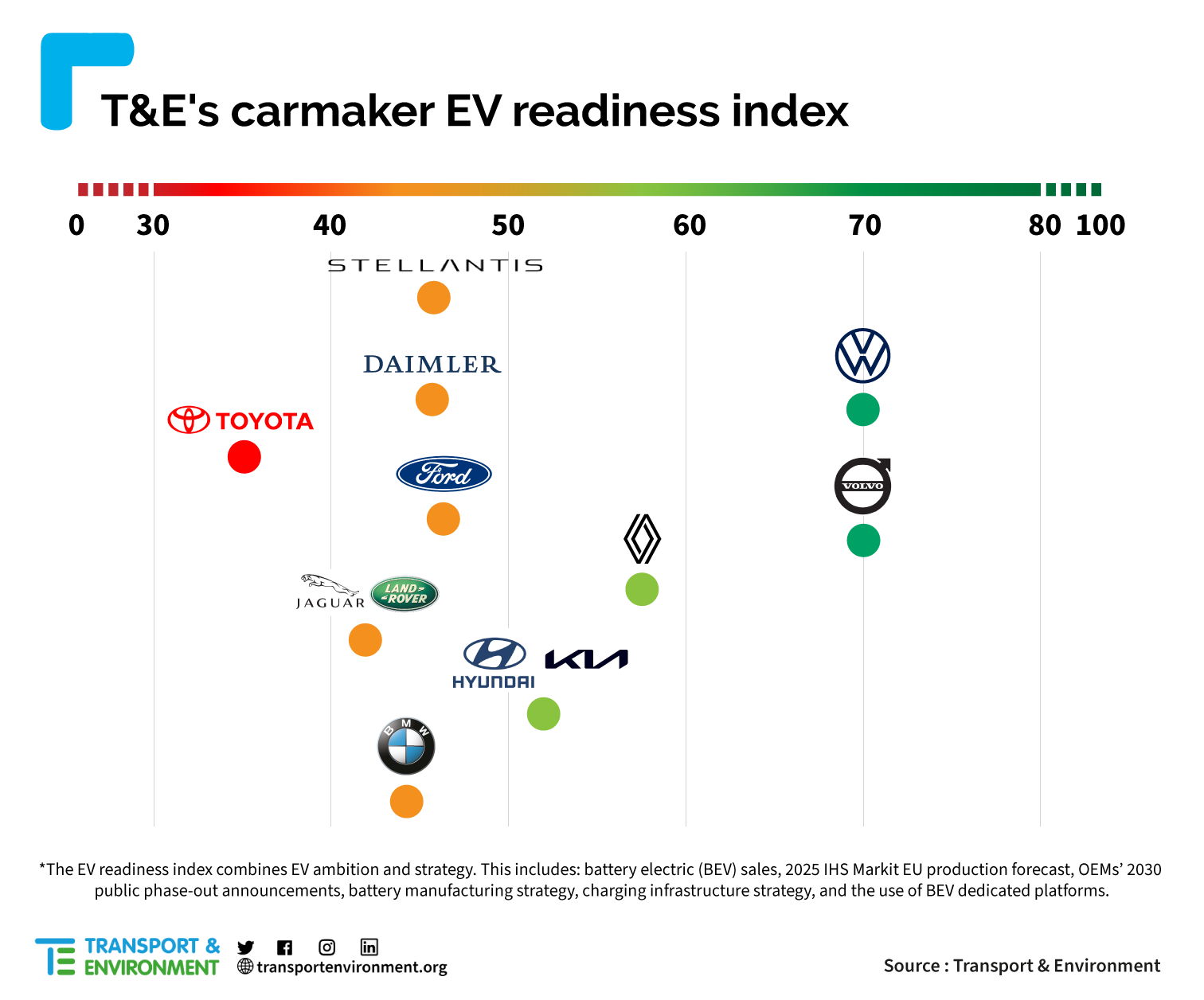 Current targets for reducing CO2 from the average new car require a 37.5% drop by 2030, but this would be easy for most makers to meet. T&E says carmakers’ current ambitions would deliver a 70% CO2 reduction cut, if they make good on their promises.