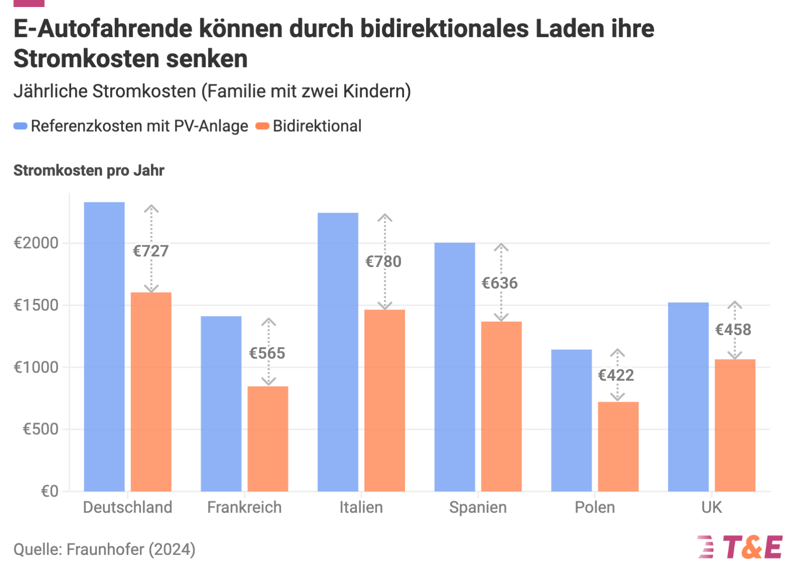 Die so genannte Vehicle-to-Grid-Technologie (V2G) kann das deutsche Energiesystem bis 2040 jährlich um 8,4 Milliarden Euro entlasten, so der Bericht der Forschungsinstitute Fraunhofer ISI und ISE für T&E. EU-weit würde sich die Einsparung auf 22 Milliarden Euro pro Jahr belaufen, was einer Senkung der Kosten für Bau und Betrieb des EU-Energiesystems um 8 Prozent entspräche. Dies könnte zwischen 2030 und 2040 zu Einsparungen von mehr als 100 Milliarden Euro führen.