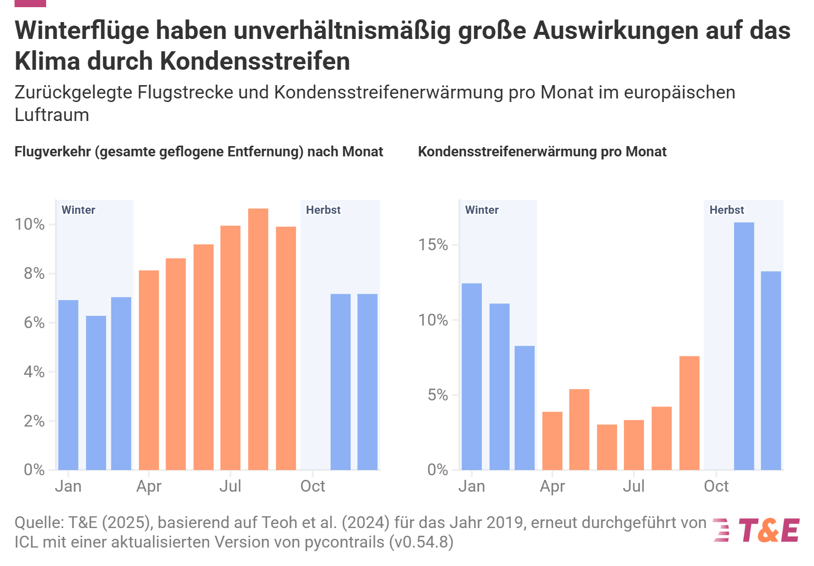 Eine neue Studie von T&E zeigt, dass die Erderwärmung durch Kondensstreifen stark von der Saison und Tageszeit abhängt. Laut Auswertung treten 75 Prozent der Erwärmung durch Kondensstreifen in Europa zwischen Januar und März sowie Oktober und Dezember auf; 40 Prozent davon in den späten Abendstunden und in der Nacht. [1] Insgesamt entfiel ein Viertel der europäischen Kondensstreifen-Erwärmung auf Herbst- und Winternächte. Diese Flüge machen nur ein Zehntel des europäischen Flugverkehrs aus. Ihre Routen könnten zur Vermeidung von Kondensstreifen leicht angepasst werden, ohne den Flugverkehr stark zu beeinträchtigen, doch mit erheblichen Vorteilen für das Klima.