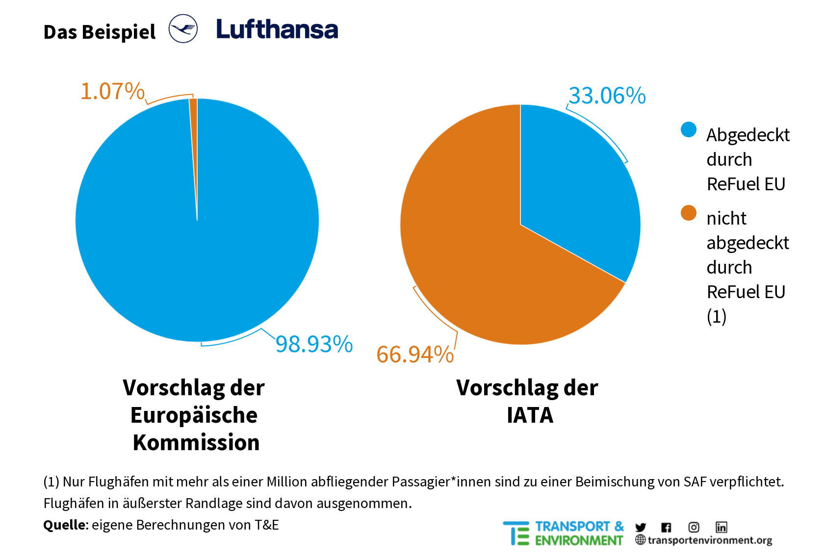 BDL und IATA, und damit auch die Lufthansa, bemühen sich um eine Abschwächung des EU-Vorschlags für nachhaltige Luftkraftstoffe (ReFuelEU), indem sie darauf pochen, dass die Kraftstoffvorgaben der EU nur bei Flügen innerhalb der EU zur Anwendung kommen daher und Flüge mit Ziel außerhalb des europäischen Wirtschaftsraumes ausschließen. Berechnungen von T&E zeigen allerdings, dass, wenn die Lobby-Bemühungen von Lufthansa von Erfolg gekrönt sein sollten, lediglich 33 Prozent der Emissionen aus Flügen, die in Europa starten, den ReFuelEU-Bestimmungen unterliegen würden. Umgekehrt bedeutet dies, dass der Großteil der Flüge nicht vom Mandat der EU für SAF betroffen wäre. Der bisherige Vorschlag der EU-Kommission umfasst 99 Prozent der Emissionen von Lufthansa-Flügen, die in Europa starten. Würde der Vorschlag der Kommission umgesetzt, wäre dies ein entscheidender Schritt bei der Bekämpfung der Klimafolgen des Luftverkehrs in der EU.