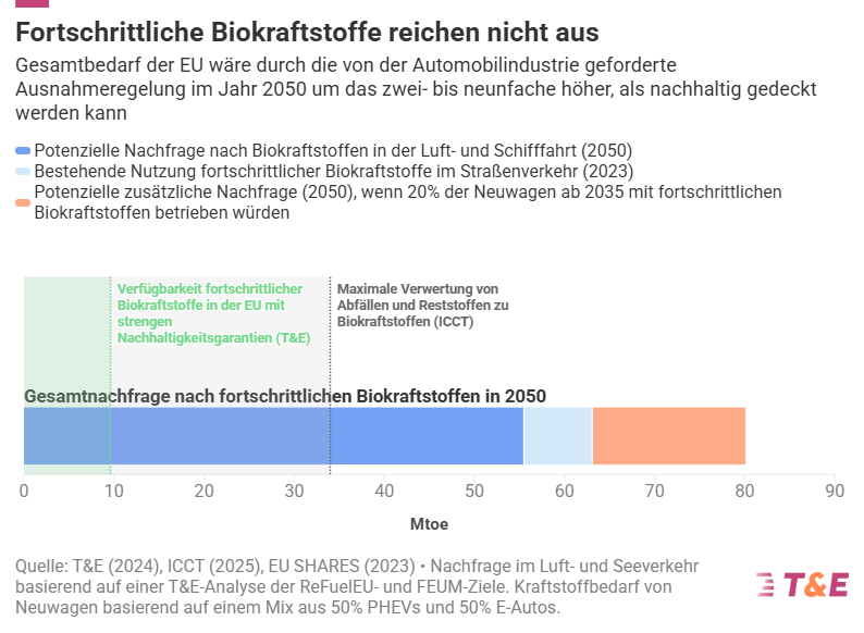 Die Automobil- und Kraftstoffindustrie machen erneut Druck, den Verkauf neuer Verbrenner, die mit Biokraftstoffen betrieben werden, auch nach 2035 zuzulassen. Diese Ausnahmeregelung war zuletzt auch durch die Länder bei der Ministerpräsidentenkonferenz gefordert worden. Das würde dazu führen, dass Autos die sehr begrenzte Menge an fortschrittlichen Biokraftstoffen verbrauchen. So würde es schwieriger, schwer zu dekarbonisierende Sektoren wie die Luftfahrt klimafreundlicher zu machen. Basierend auf den aktuellen europäischen Zielen werden allein Flugzeuge und Schiffe im Jahr 2050 etwa doppelt so viel fortschrittliche Biokraftstoffe benötigen, wie in Europa – im optimistischsten Szenario – nachhaltig hergestellt werden können.