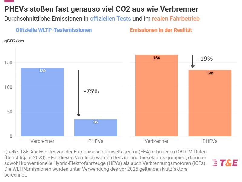 Laut T&E-Analyse stoßen PHEVs in der Praxis durchschnittlich 135 g CO2 pro km aus. Zum Vergleich: Verbrenner stoßen durchschnittlich 166 g CO2/km aus. Die Analyse basiert auf Daten der Europäischen Umweltagentur (EEA), die von Kraftstoffmessgeräten in 127.000 Fahrzeugen erfasst wurden, die 2023 zugelassenen wurden.
