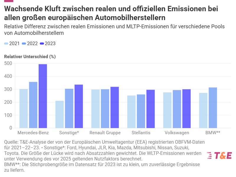 Die Analyse der EU-Daten zeigt, dass bei Mercedes der Unterschied zwischen den offiziellen und tatsächlichen Emissionen am größten ist. In der Realität waren sie durchschnittlich 494 Prozent höher. Die GLE-Klasse hat die höchste Emissionsdifferenz aller 2023 verkauften Fahrzeuge. Sie überschreitet den offiziellen Wert um 611 Prozent. Die anderen großen europäischen Automobilhersteller emittierten rund 300 Prozent mehr als ihre offiziellen CO2-Werte.