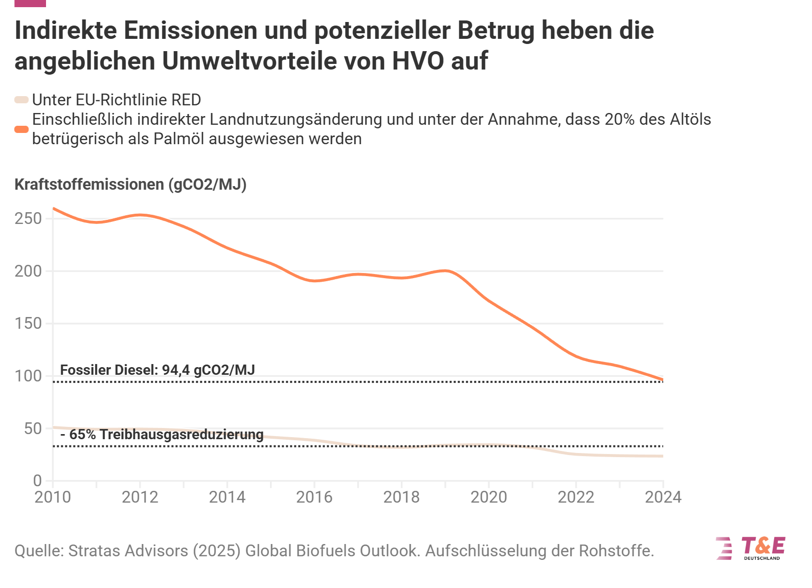 Selbst im besten Fall (unter der Annahme vollständig nachhaltiger Rohstoffe und ohne Unregelmäßigkeiten) halbiert der Einsatz von HVO die CO₂-Emissionen im Vergleich zu fossilem Diesel nur. Dabei werden indirekte Emissionen berücksichtigt.