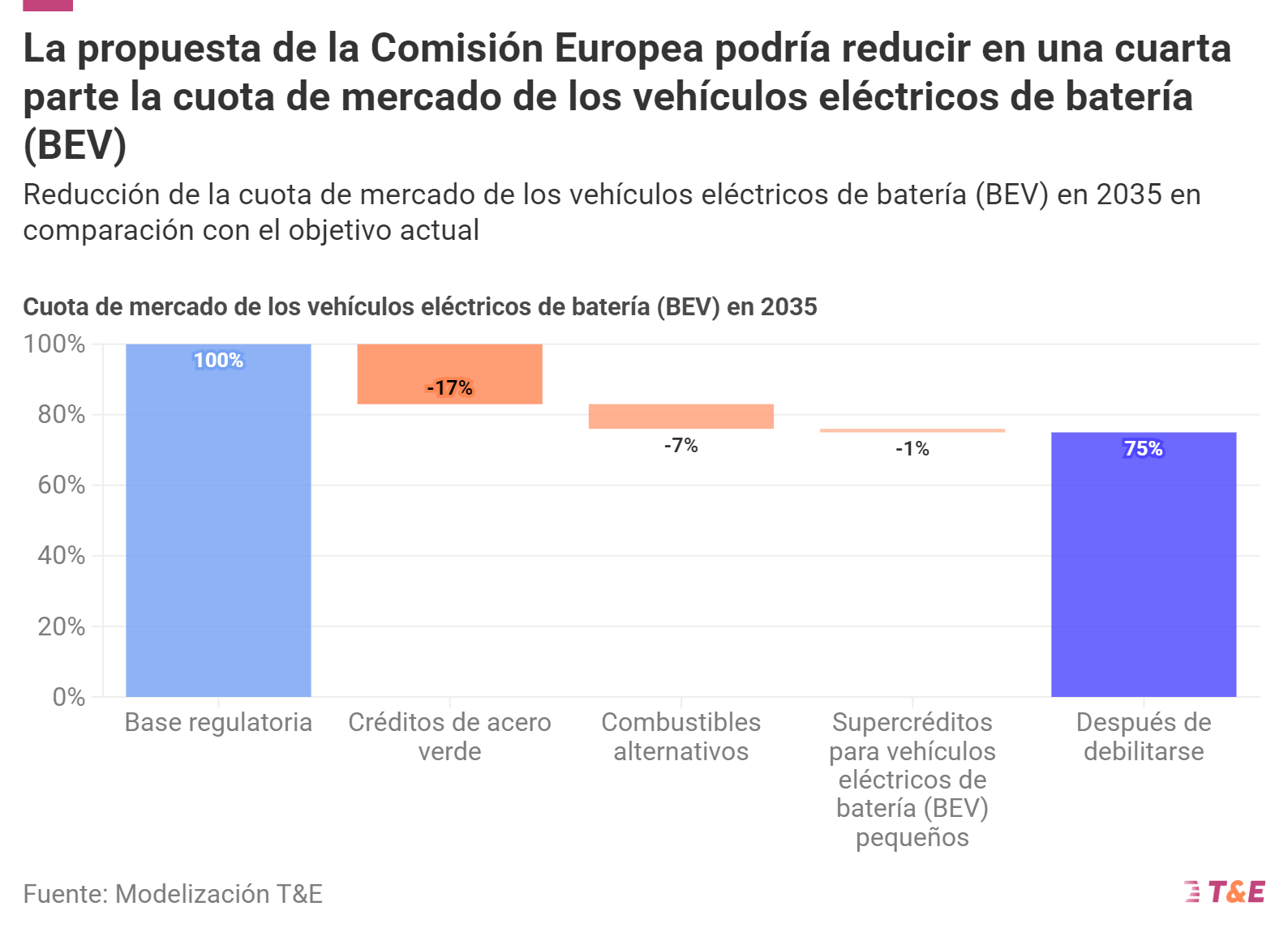 El objetivo de cero emisiones en 2035 se rebajaría a una reducción del 90 % de las emisiones de CO2.Esto abre la puerta a que sigan vendiéndose incluso los vehículos con motor de combustión más contaminantes. T&E calcula que en 2035 se venderían hasta un 25 % menos de vehículos eléctricos de batería que con el objetivo actual [1]. Sin embargo, los BEV seguirán dominando el mercado automovilístico a partir de 2030.