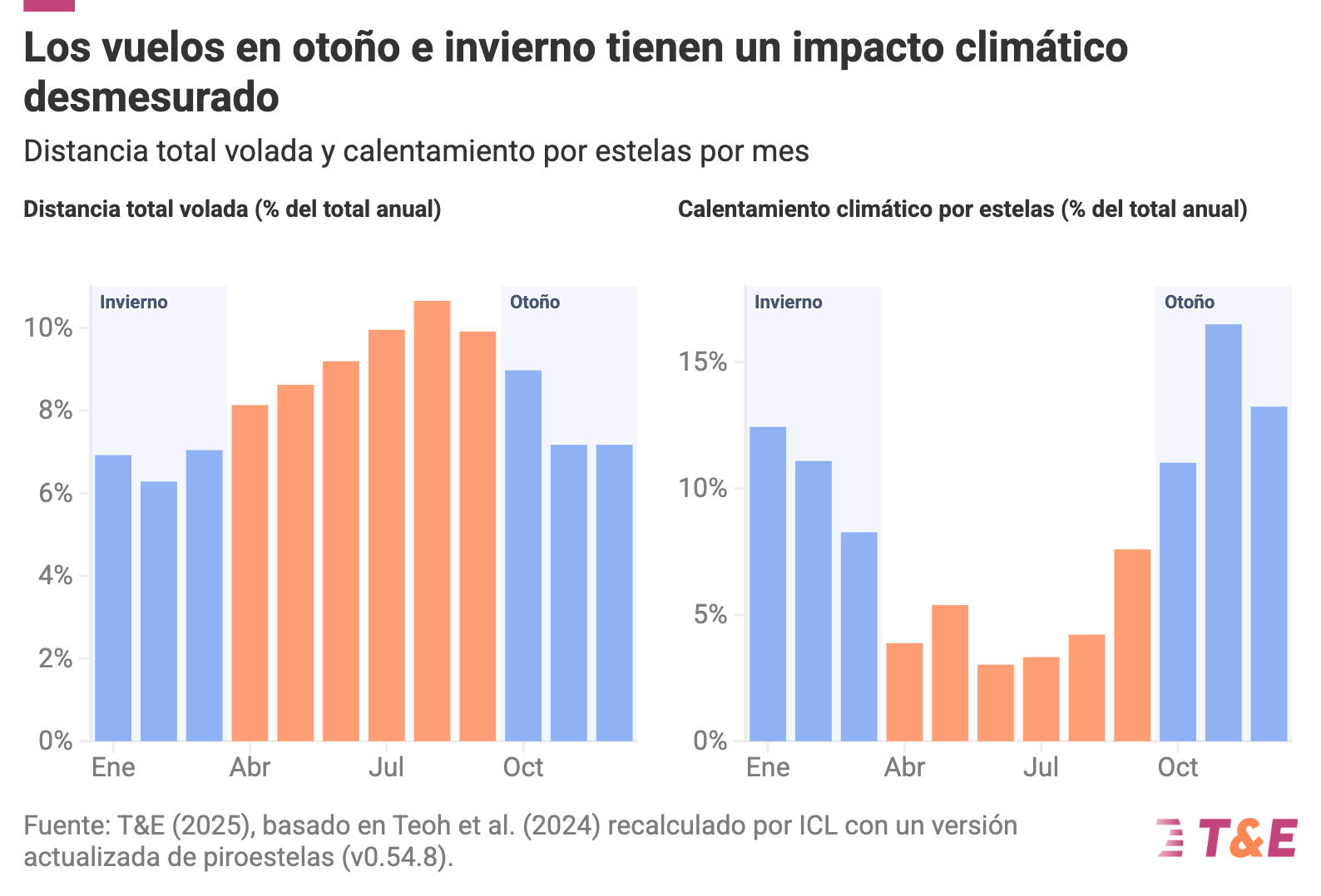 El calentamiento por estelas de condensación es un fenómeno muy estacional y se concentra en determinados periodos del año: en 2019, el 75 % del calentamiento por estelas de condensación en Europa se produjo entre enero y marzo, y entre octubre y diciembre, y el 40 % durante las últimas horas de la tarde y la noche. En conjunto, según un nuevo informe de T&E, los vuelos nocturnos en otoño e invierno representaron el 25 % del calentamiento por estelas de condensación en Europa, suponiendo solo el 10 % del tráfico aéreo. Estos periodos crean las condiciones idóneas para ajustar un pequeño número de vuelos con efectos mínimos en el tráfico aéreo y grandes beneficios para el clima.