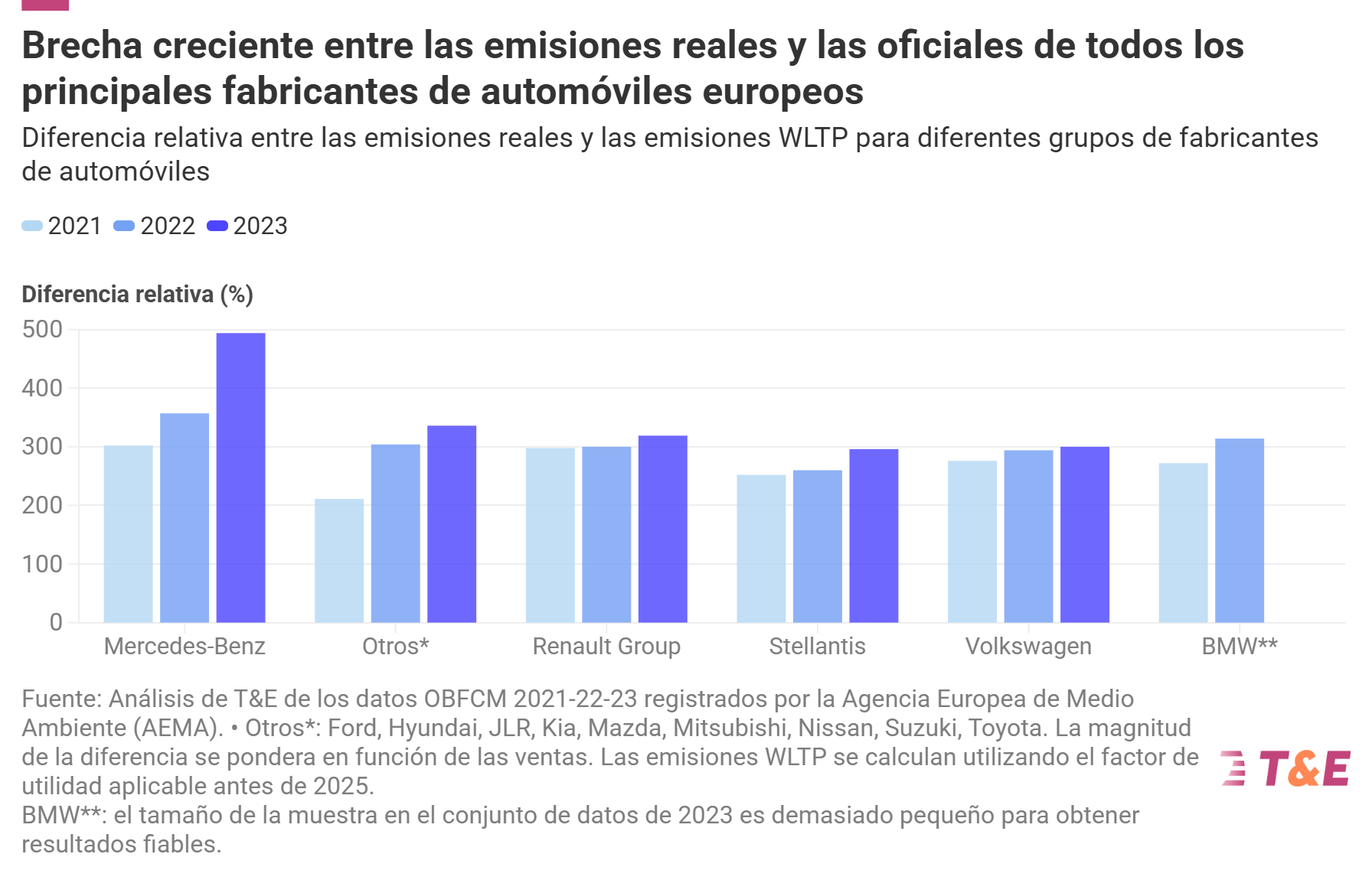 Mercedes-Benz presenta la mayor diferencia entre las emisiones oficiales y las reales de sus vehículos híbridos enchufables, según los datos de 2023, con un aumento medio del 494 %. Su clase GLE presenta la mayor diferencia entre las emisiones reales y las oficiales de los coches vendidos ese año, superando su valor oficial en un 611 %. Los demás grandes fabricantes de automóviles europeos emitieron alrededor de un 300 % más que sus valores oficiales de CO₂.