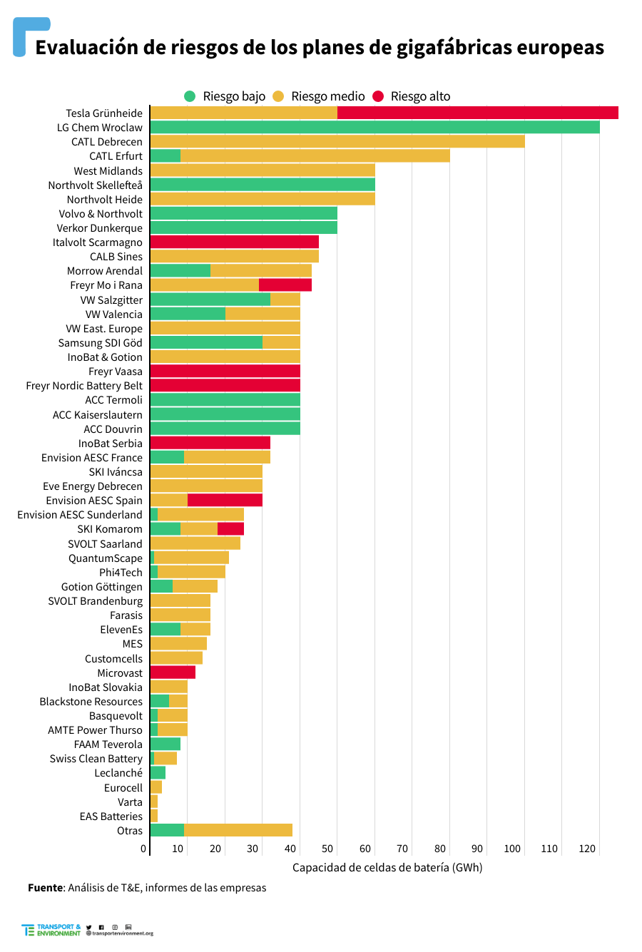 Alemania, Hungría, España, Italia y el Reino Unido son los que más pueden perder si los fabricantes de baterías cambian de planes. La planta Tesla Giga Berlín es la que corre mayor riesgo de sufrir retrasos en Europa después de que anunciara que centrará la fabricación de celdas de baterías en EE. UU. para aprovechar los incentivos de la Ley de Reducción de la Inflación (IRA, por sus siglas en inglés). Existe un riesgo medio para la gigafactoría prevista por Northvolt en Heide (Alemania), ya que la empresa sólo ha conseguido parte de la financiación y no ha iniciado la construcción. Además, el consejero delegado de Northvolt dijo el pasado octubre que podría retrasar la planta y priorizar la expansión en Estados Unidos.