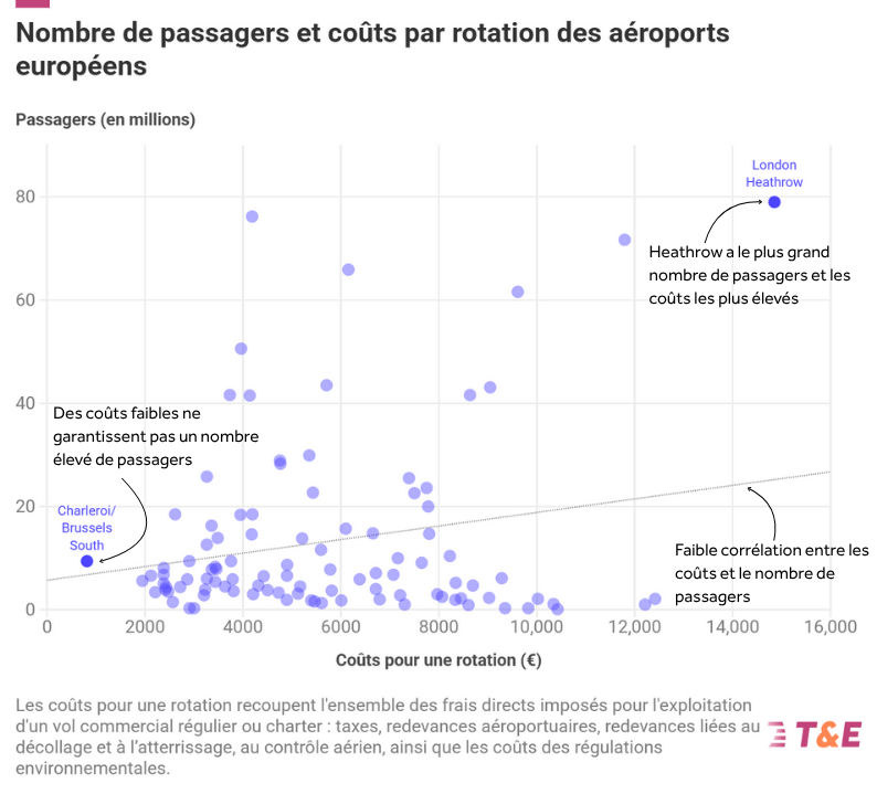 L'étude examine la relation entre les diverses taxes, redevances et autres coûts payés à un aéroport donné et le volume de passagers pour 101 aéroports européens en 2024 [1]. Les résultats montrent que les aéroports ayant de faibles coûts n'ont pas forcément un nombre plus élevé de passagers. En fait, les aéroports dont les coûts sont plus élevés ont tendance à accueillir davantage de passagers. L'aéroport d'Heathrow, par exemple, a les coûts les plus élevés, mais aussi le nombre de passagers le plus élevé d'Europe.
