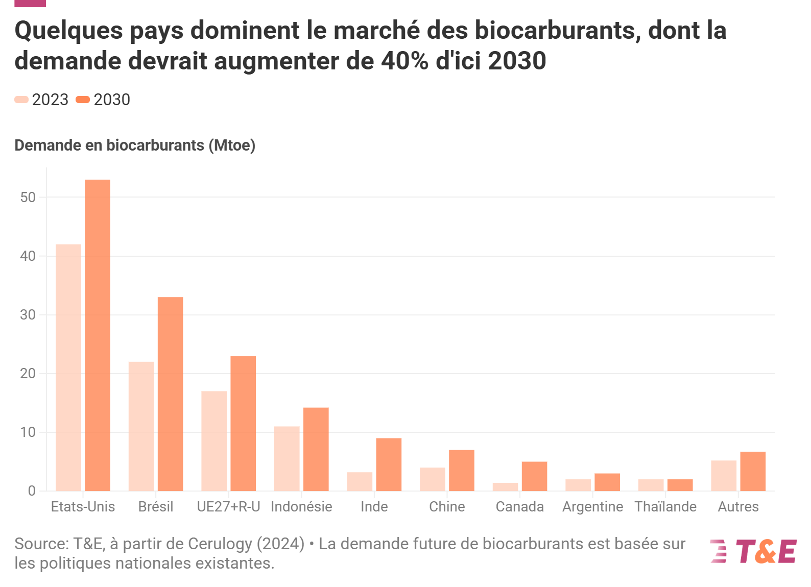 Pays hôte de la future COP 30, le Brésil est l'un des producteurs de biocarburants qui connaît la croissance la plus rapide et rattrape les États-Unis, le plus grand producteur mondial de biocarburants. Il a récemment décidé de suspendre son moratoire sur le soja, qui protégeait la forêt amazonienne de la déforestation. Le Canada et l'Inde font également partie des pays qui devraient augmenter massivement leur production. L'analyse de T&E se base sur les politiques et stratégies gouvernementales existantes, mais la demande en biocarburants pourrait également connaître une forte hausse dans les secteurs du transport maritime et de l'aviation, qui s'efforcent de trouver des alternatives aux combustibles fossiles.