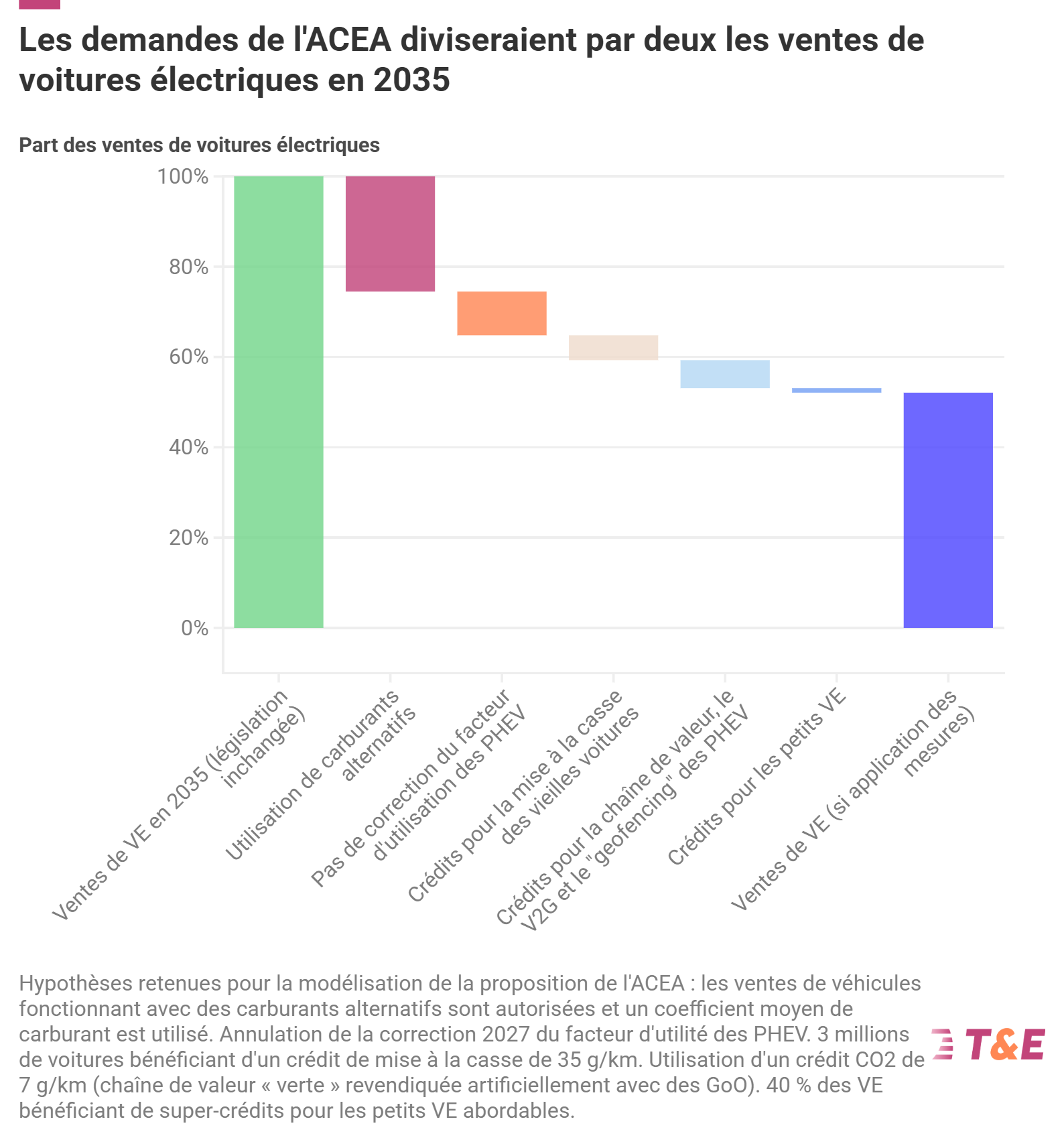 La demande de l'ACEA visant à supprimer la révision du « facteur d’utilité » (UF) de 2027 pour les hybrides rechargeables réduirait les ventes de voitures électriques de 10 % en 2035. L'octroi de crédits carbone aux constructeurs automobiles pour la mise au rebut des vieux véhicules réduirait encore l'ambition de 6 %. Les crédits pour les réductions de CO2 dans la production automobile et l'utilisation de certaines technologies réduiraient les ventes de véhicules électriques de 6 %. L’introduction d’un multiplicateur pour les ventes de petits véhicules électriques – avec un crédit supplémentaire s'ils sont fabriqués en Europe – réduirait l'ambition de 1 %. Au total, les exigences de l'ACEA signifieraient que les constructeurs automobiles n'auraient qu'à atteindre une part de marché de 52 % de voitures électriques en 2035.