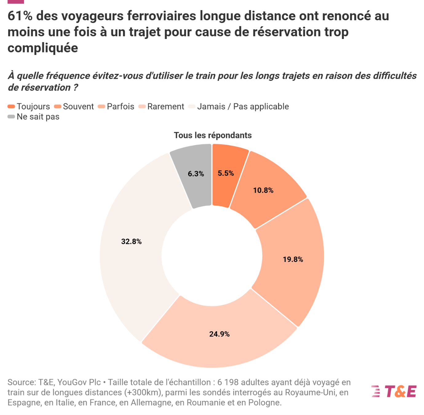 Les difficultés liées à la réservation de billets de train dissuadent de nombreux voyageurs. Deux tiers des Français (66 %) et 61 % des personnes interrogés dans l’ensemble des pays sondés pratiquant les voyages longue distance en train [1] ont évité, au moins une fois, d’acheter un billet en raison de difficultés liées à la réservation, selon un nouveau sondage YouGov réalisé pour T&E dans sept pays [2]. Pour les pays européens ayant participé au sondage, 43 % des utilisateurs du train longue distance utiliseraient davantage ce mode de transport si la réservation en ligne était plus facile (46% en France).