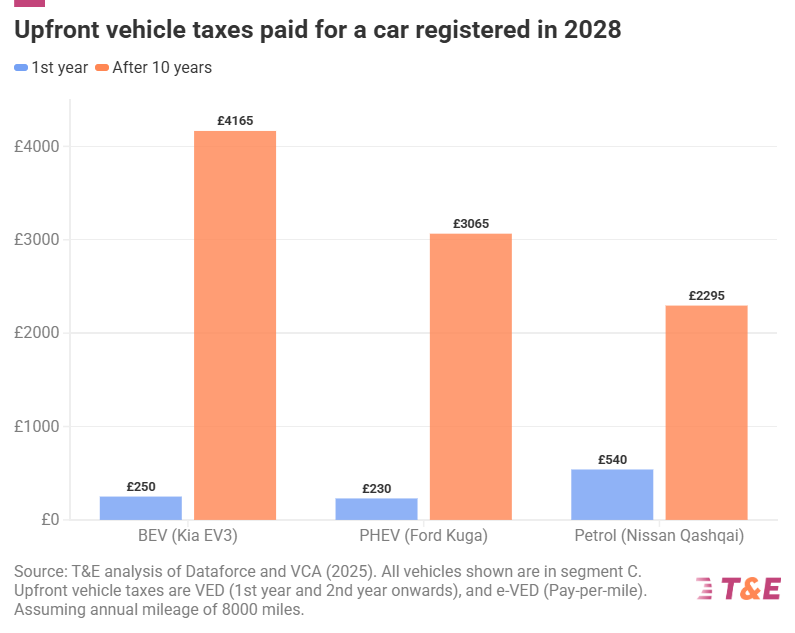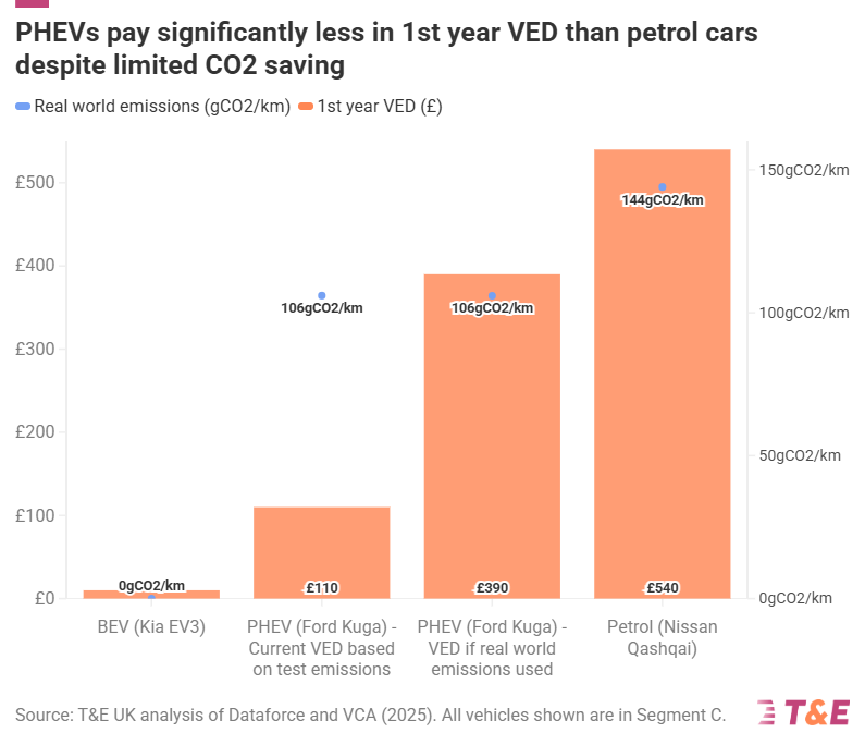 T&E UK warns that this imbalance compounded by outdated Vehicle Excise Duty (VED) rules that understate PHEV emissions sends the wrong signal to consumers and risks slowing the shift to fully electric cars.