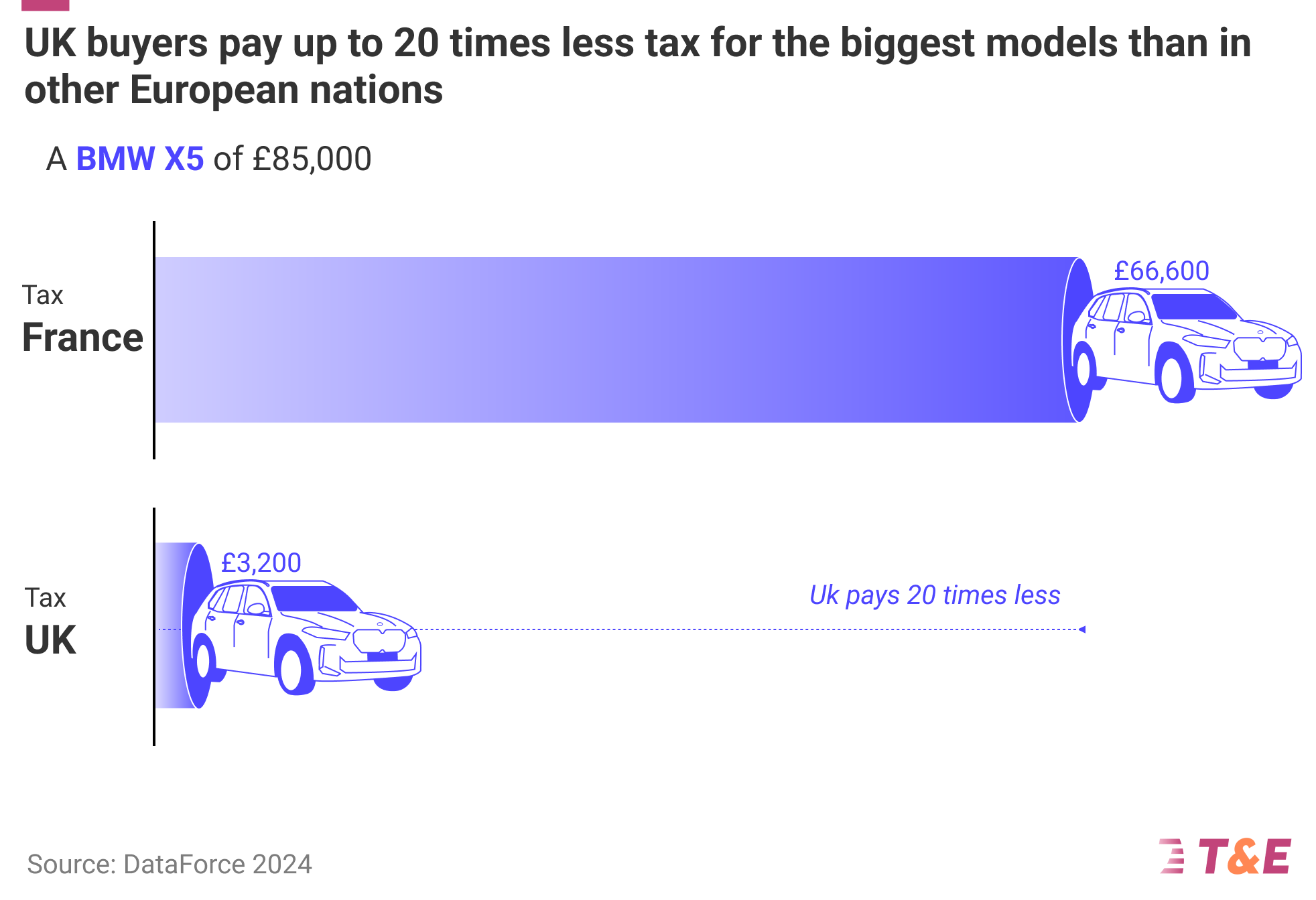 The UK acts as a tax haven for these cars, with the UK ranking 16th among European countries for tax paid on the purchase of a big SUV. Under the current system, a buyer in the UK would pay up to twenty times less tax for the same luxury large SUV than they would in France.