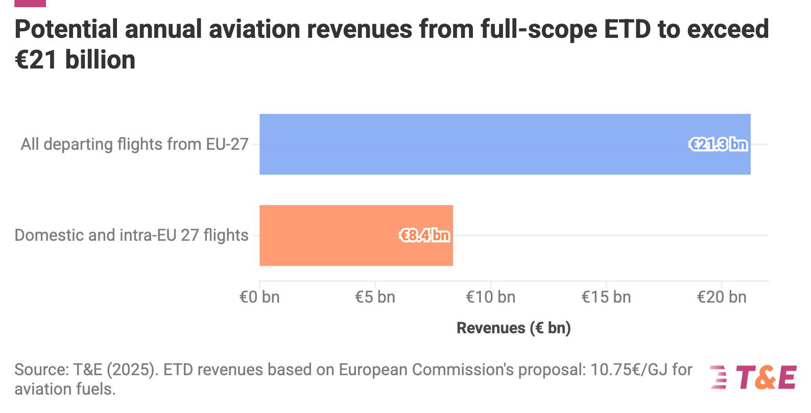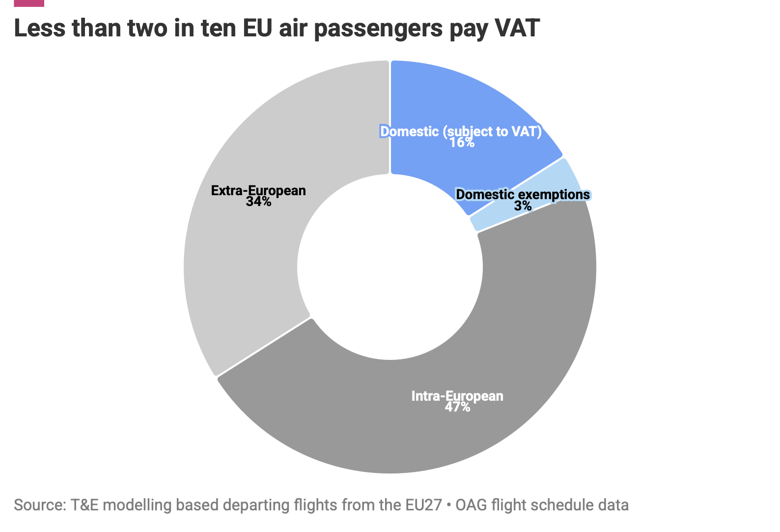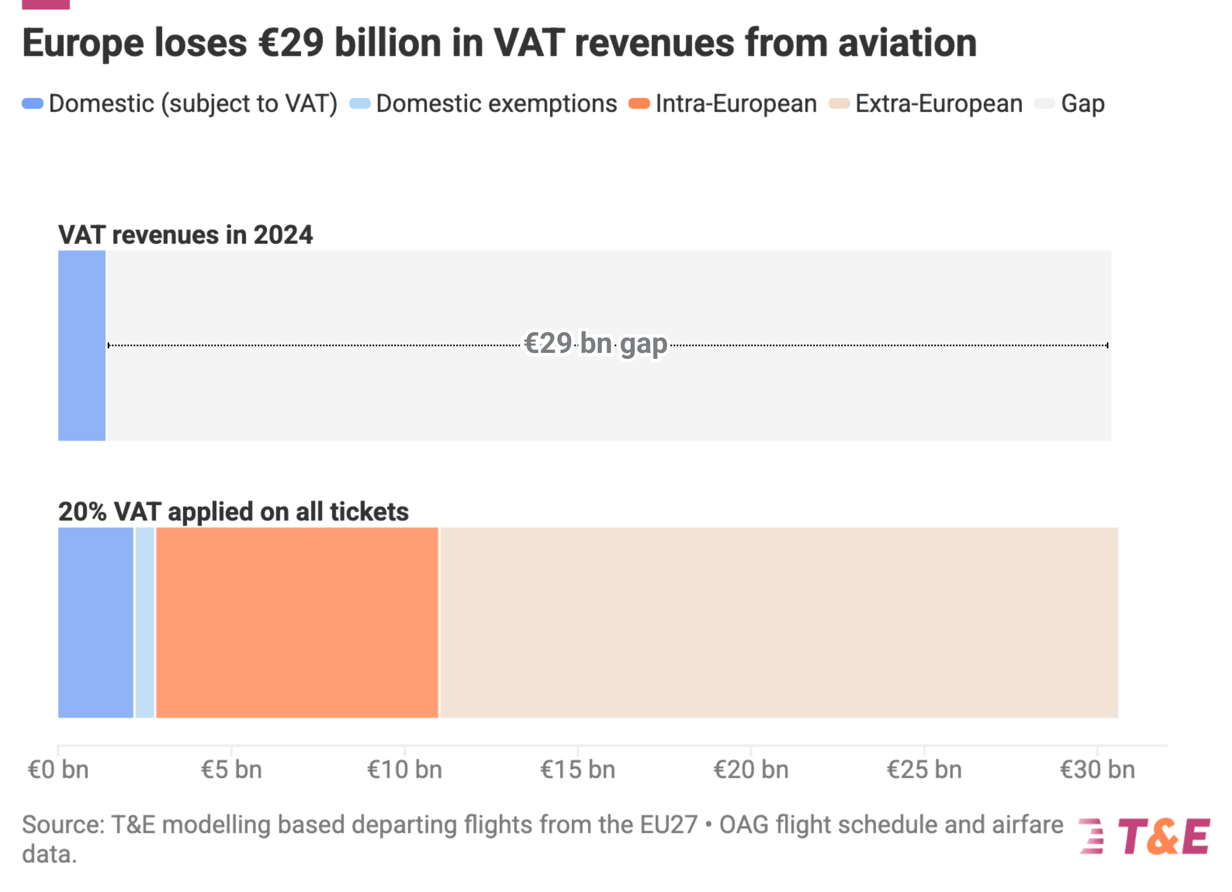 The VAT exemption for aviation comes at a high cost to public finances. T&E estimates that only €1.4 billion in VAT was collected from air travel in 2024. Removing the exemption and applying a standard 20% VAT rate to all tickets departing from the EU would have raised more than €30 billion, leaving a VAT gap of around €29 billion in a single year.